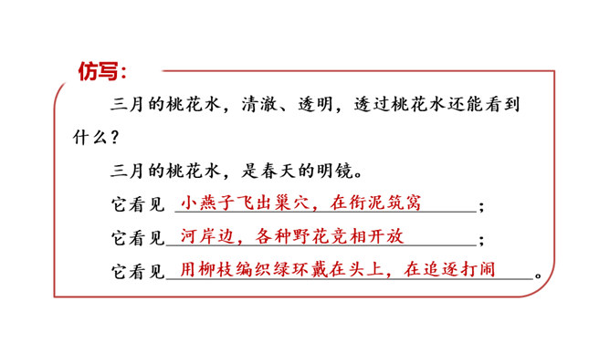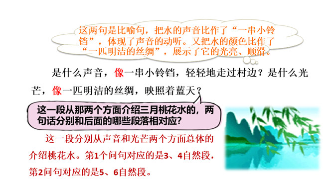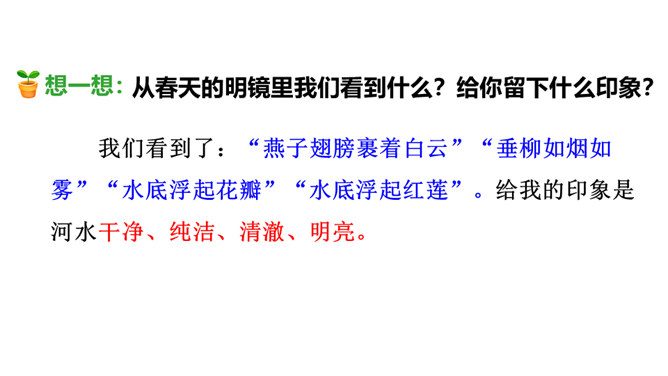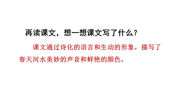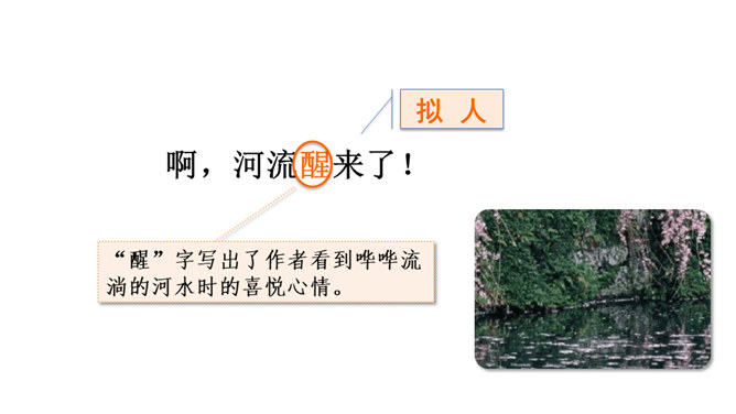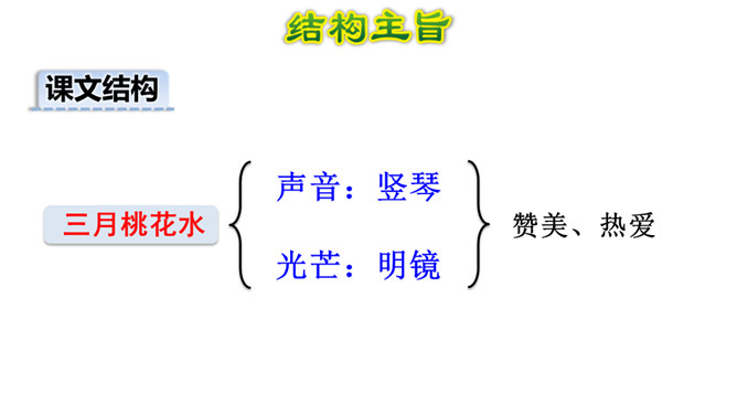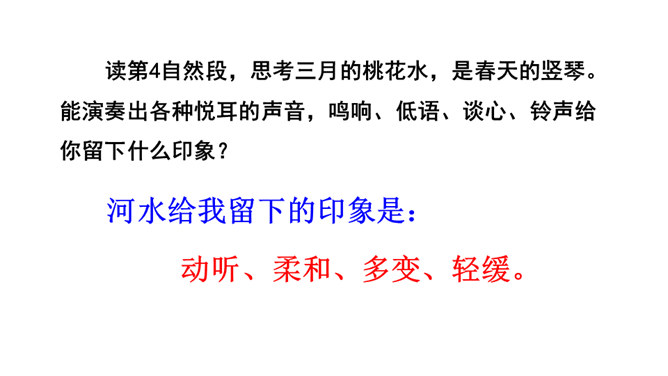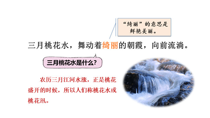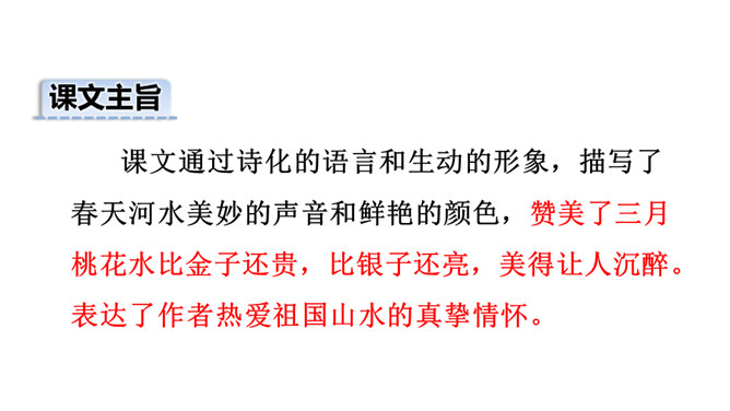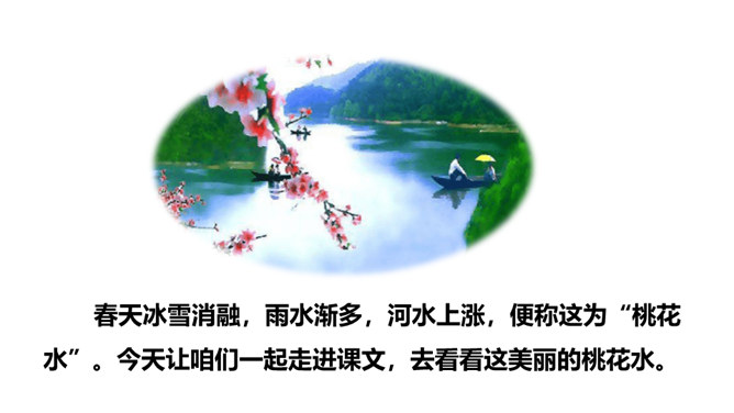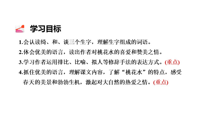 春天冰雪消融,雨水渐多,河水上涨,便称这为“桃花水”。今天让咱们一起走进课文,去看看这美丽的桃花水。1.会认读绮、和、谈三个生字,理解生字组成的词语。2.体会优美的语言,读出作者对桃花水的喜爱和赞美之情。3.学习作者运用排比、比喻、拟人等修辞手法的表达方式。(重点)4.抓住优美的语言,理解课文内容,了解“桃花水”的特点,感受春天的美景和勃勃生机,激起对大自然的热爱之情。(重点)所属专题:三月桃花水ppt。