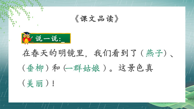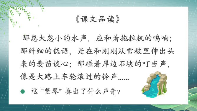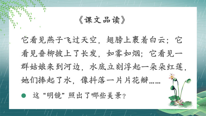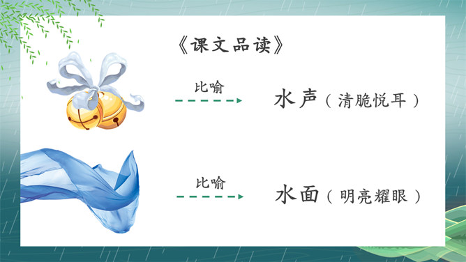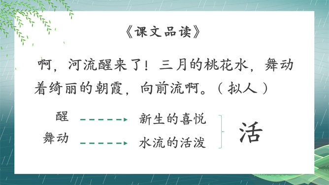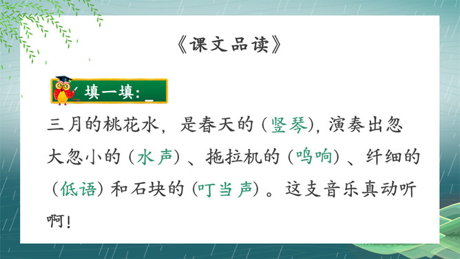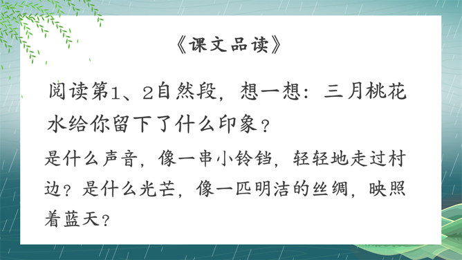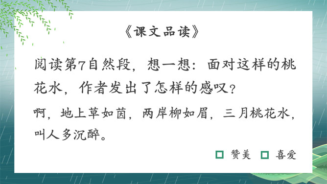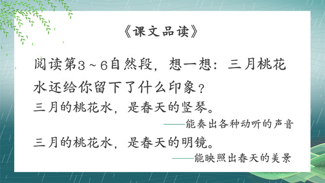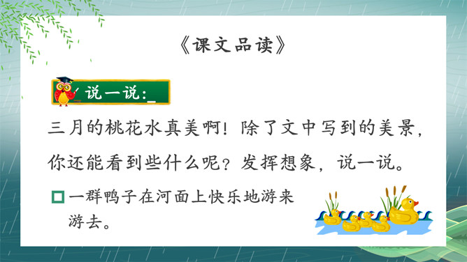 搜集关于春水的诗词名句或谚语、俗语,扩充自己的知识面。阅读关于春水的文章,并写一写你对春水的感悟。假如你就是三月春水,你会对燕子、垂柳和那群姑娘说些什么呢?提示:可以运用比喻、拟人、排比等修辞手法,按照一定的顺序,写清楚这处景观的特点或春天游园的所见所想,要写出自己的独特感受。三月的桃花水真美啊!除了文中写到的美景,你还能看到些什么呢?发挥想象,说一说。所属专题:三月桃花水ppt。