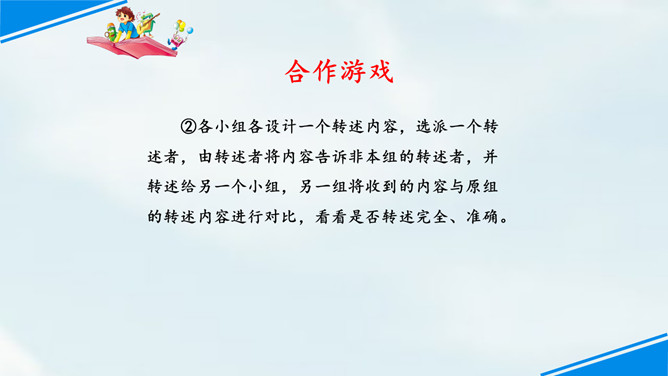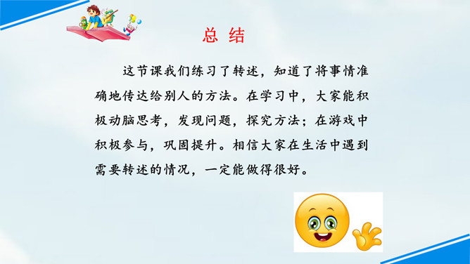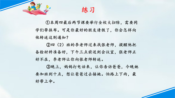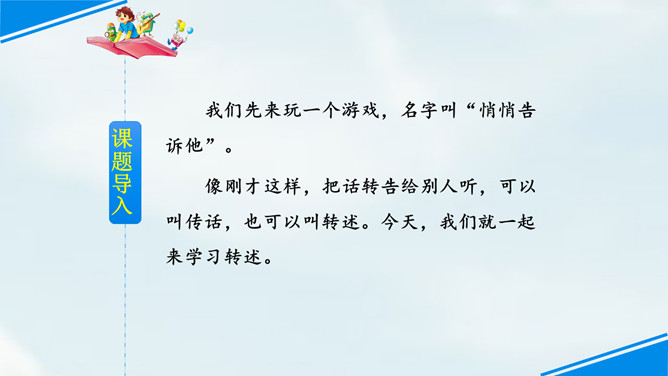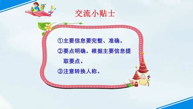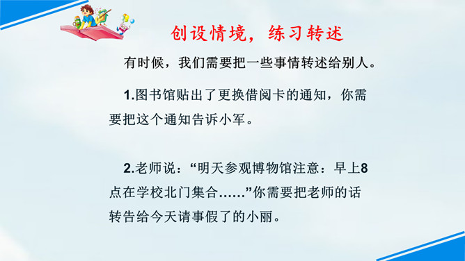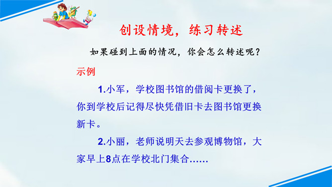 我们先来玩一个游戏,名字叫“悄悄告诉他”。像刚才这样,把话转告给别人听,可以叫传话,也可以叫转述。今天,我们就一起来学习转述。有时候,我们需要把一些事情转述给别人。1.图书馆贴出了更换借阅卡的通知,你需要把这个通知告诉小军。2.老师说:“明天参观博物馆注意:早上8点在学校北门集合……”你需要把老师的话转告给今天请事假了的小丽。①主要信息要完整、准确。②要点明确。根据主要信息提取要点。③注意转换人称。所属专题:转述ppt。