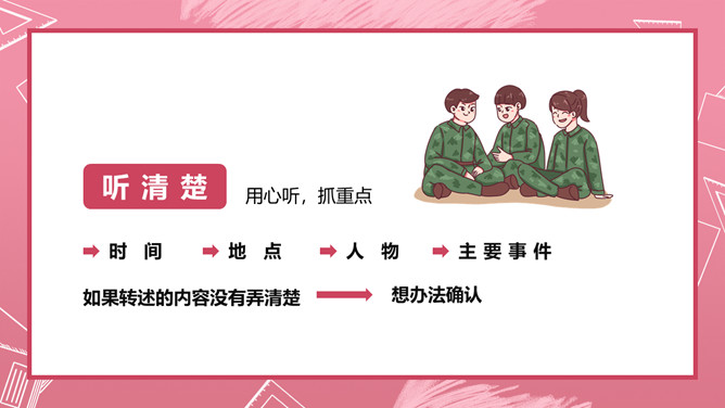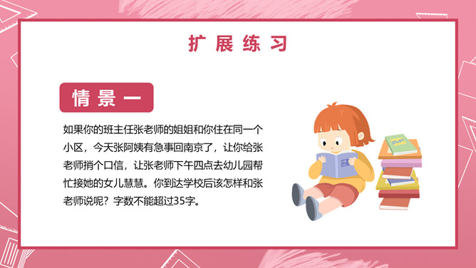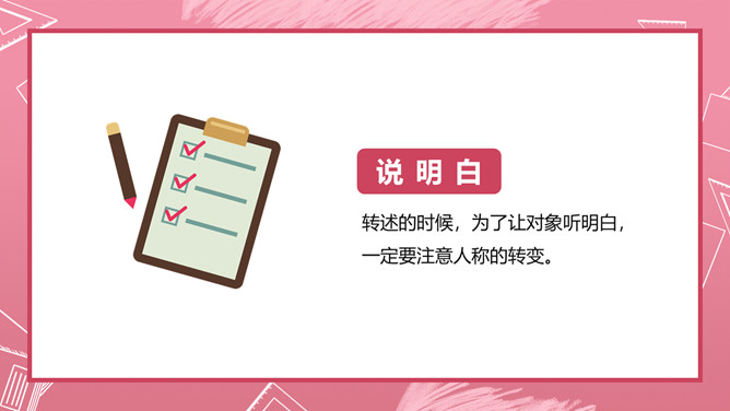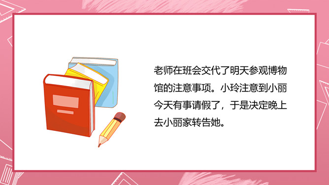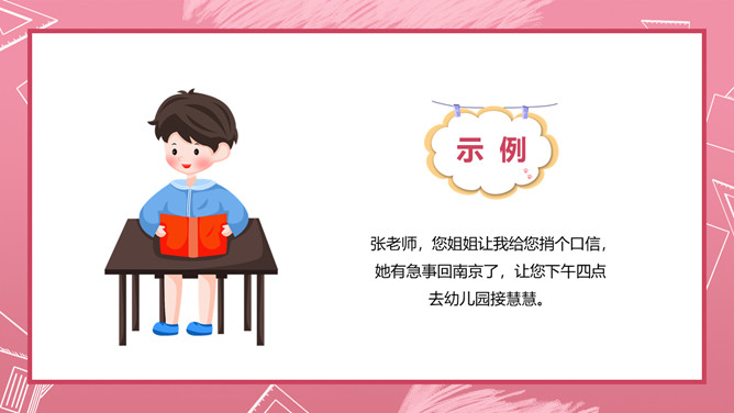爸爸妈妈,告诉你们一件事。本周五,也就是本月23日下午两点,在我们四(3)班教室召开家长会,交流家庭的阅读情况,评选出“书香家庭”,请你们参加。不过要注意的是,请你们带好纸和笔,以便填写选票;你们最好乘公汽到校,因为学校停车不方便;要提前十分钟到会场,开会期间关闭手机,保持安静。你们听清楚了吗?学校通知栏贴出了下面的通知,请你放学回家后当面将这个通知转述给爸爸妈妈,并打电话转述给因生病请假的李响同学。所属专题:转述ppt。