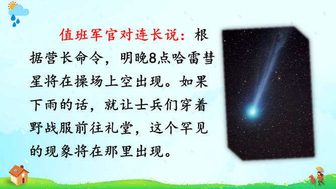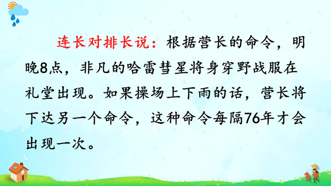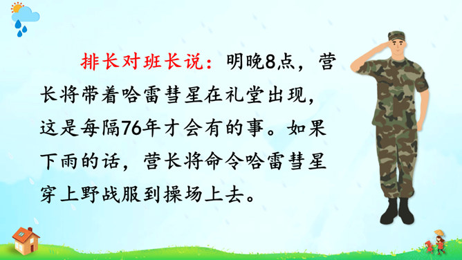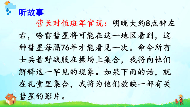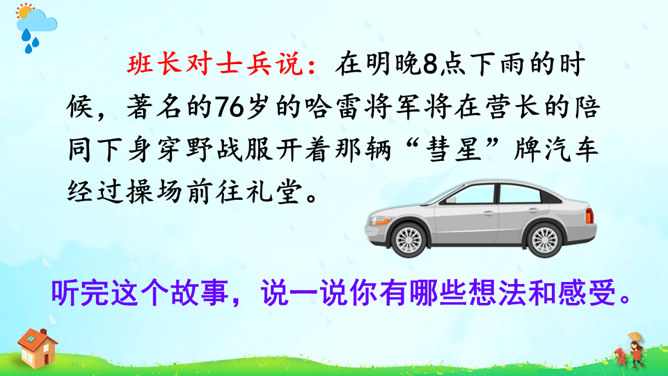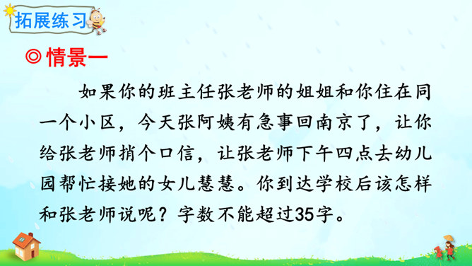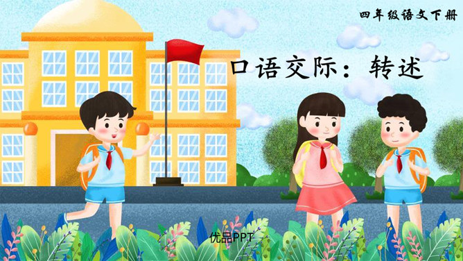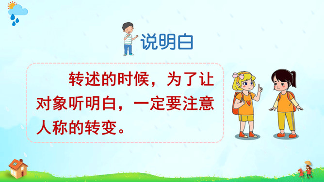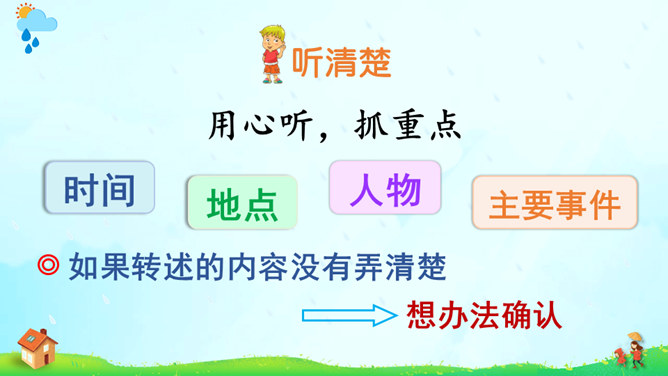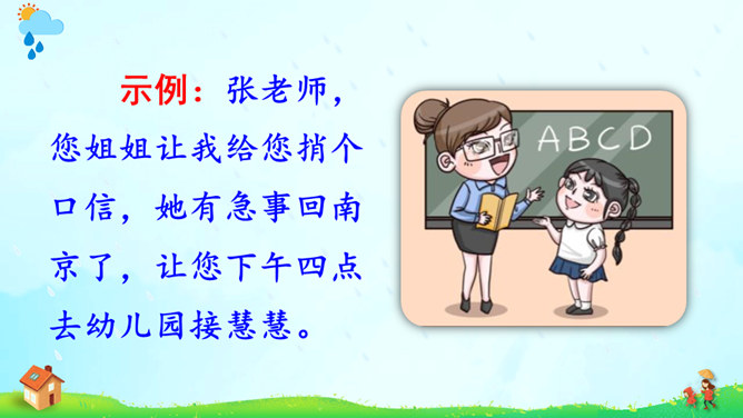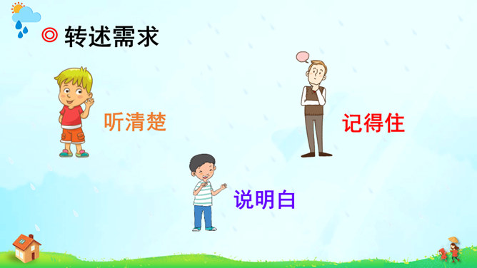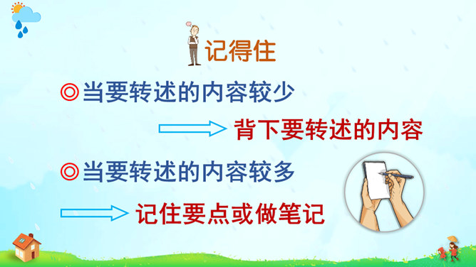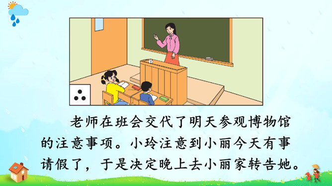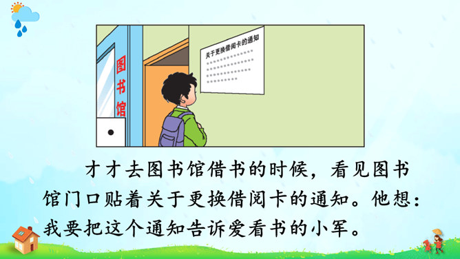 才才去图书馆借书的时候,看见图书馆门口贴着关于更换借阅卡的通知。他想:我要把这个通知告诉爱看书的小军。傍晚,才才在路上碰见了小军,他赶紧把图书馆更换借阅卡的时间、费用和注意事项一一转述给小军。小军听后十分感谢才才。老师在班会交代了明天参观博物馆的注意事项。小玲注意到小丽今天有事请假了,于是决定晚上去小丽家转告她。放学后,小玲来到小丽家。小玲对小丽说:“小丽,我们明天要去参观博物馆,早上8点在学校北门集合,你别跑错地方啦。”所属专题:转述ppt。