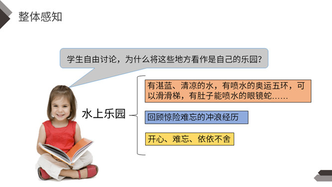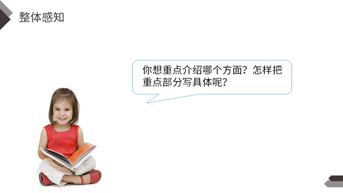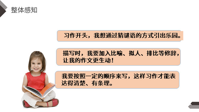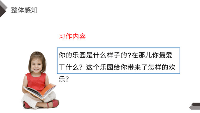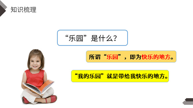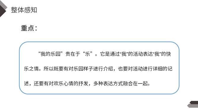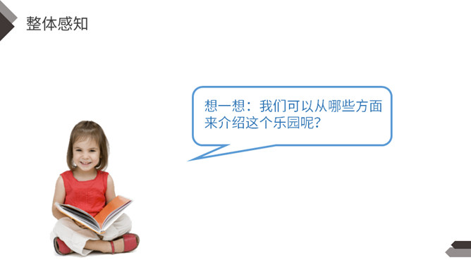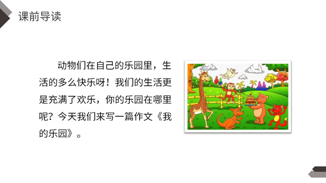 “我的乐园”贵在于“乐”。它是通过“我”的活动表达“我”的快乐之情。所以既要有对乐园样子进行介绍,也要对活动进行详细的记述,还要有对欢乐心情的抒发,多种表达方式融合在一起。你的乐园是什么样子的?在那儿你最爱干什么?这个乐园给你带来了怎样的欢乐?1.要介绍的乐园是什么?2.它是什么样子的?3.你都参加过哪些活动?哪一部分作为重点将要进行具体介绍?4.打算拟定什么题目?所属专题:我的乐园ppt。