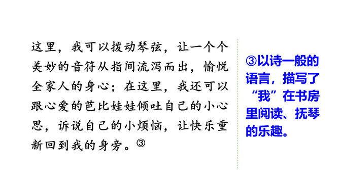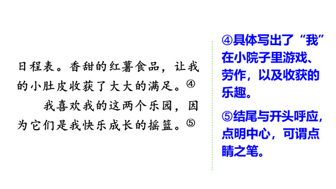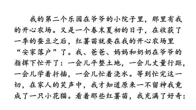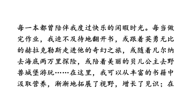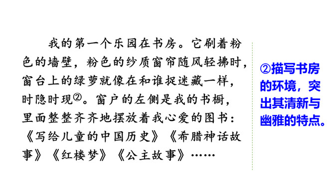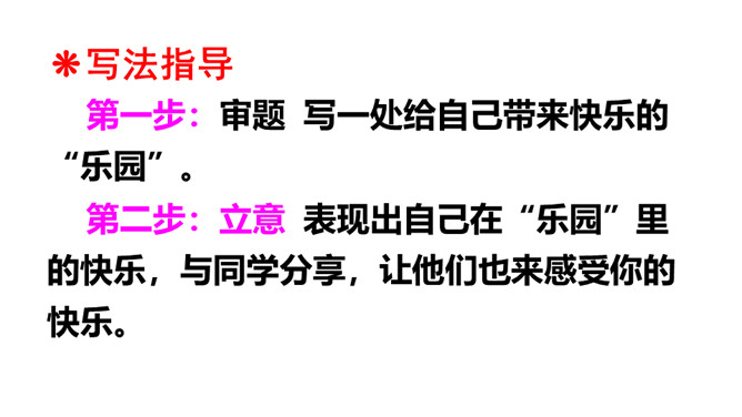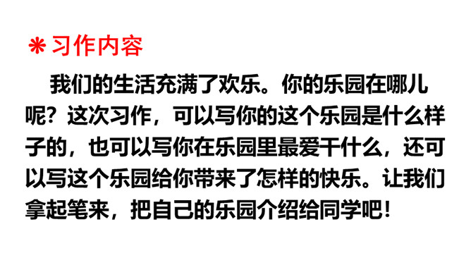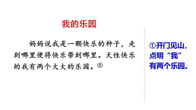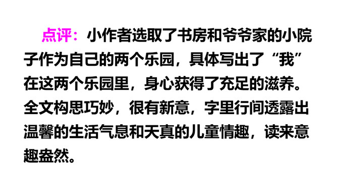 我们的生活充满了欢乐。你的乐园在哪儿呢?这次习作,可以写你的这个乐园是什么样子的,也可以写你在乐园里最爱干什么,还可以写这个乐园给你带来了怎样的快乐。让我们拿起笔来,把自己的乐园介绍给同学吧!点评:小作者选取了书房和爷爷家的小院子作为自己的两个乐园,具体写出了“我”在这两个乐园里,身心获得了充足的滋养。全文构思巧妙,很有新意,字里行间透露出温馨的生活气息和天真的儿童情趣,读来意趣盎然。所属专题:我的乐园ppt。