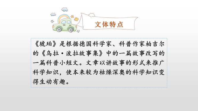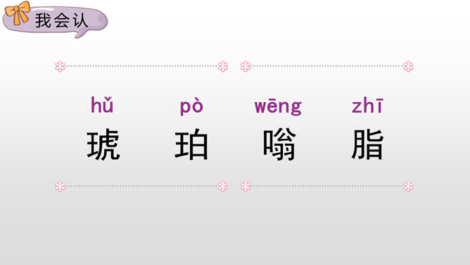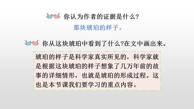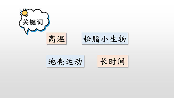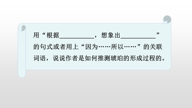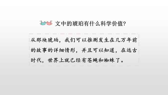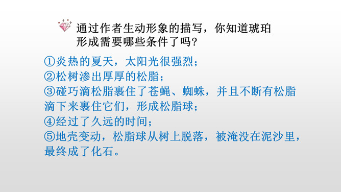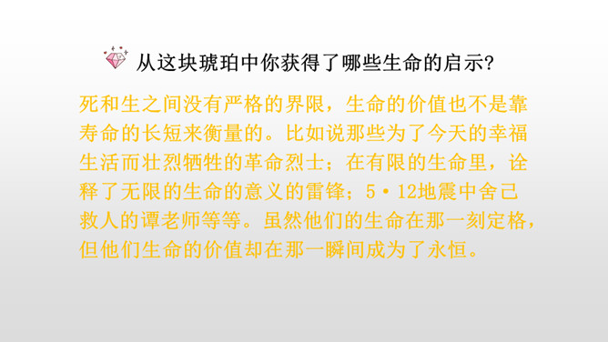 通过作者生动形象的描写,你知道琥珀形成需要哪些条件了吗?①炎热的夏天,太阳光很强烈;②松树渗出厚厚的松脂;③碰巧滴松脂裹住了苍蝇、蜘蛛,并且不断有松脂滴下来裹住它们,形成松脂球;④经过了久远的时间;⑤地壳变动,松脂球从树上脱落,被淹没在泥沙里,最终成了化石。从这块琥珀中你获得了哪些生命的启示?死和生之间没有严格的界限,生命的价值也不是靠寿命的长短来衡量的。比如说那些为了今天的幸福生活而壮烈牺牲的革命烈士;在有限的生命里,诠释了无限的生命的意义的雷锋;5·12地震中舍己救人的谭老师等等。所属专题:琥珀ppt。