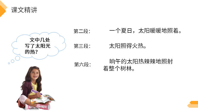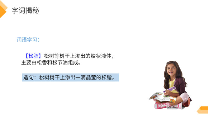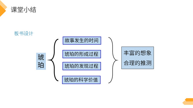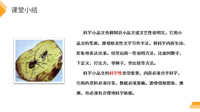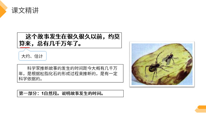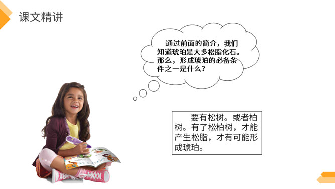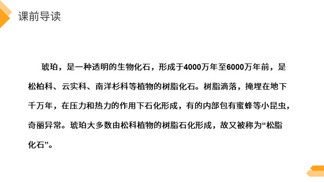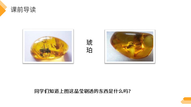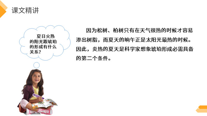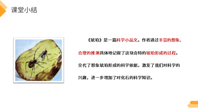 夏日火热的阳光跟琥珀的形成有什么关系?因为松树、柏树只有在天气很热的时候才容易渗出树脂,而夏天的晌午正是太阳光最热的时候。因此,炎热的夏天是科学家想象琥珀形成必需具备的第二个条件。作者通过丰富的想象、合理的推测具体地记叙了这块奇特的琥珀形成的过程。交代了想象琥珀形成的科学依据,激发了我们对科学的兴趣,进一步增加了对化石的科学知识。学习课文中拟人的修辞手法,仿写一句拟人句。所属专题:琥珀ppt。