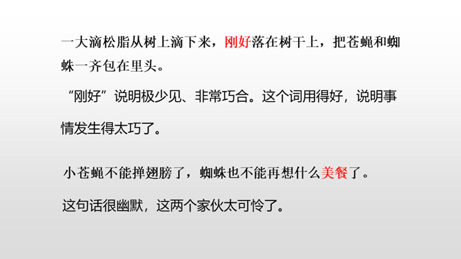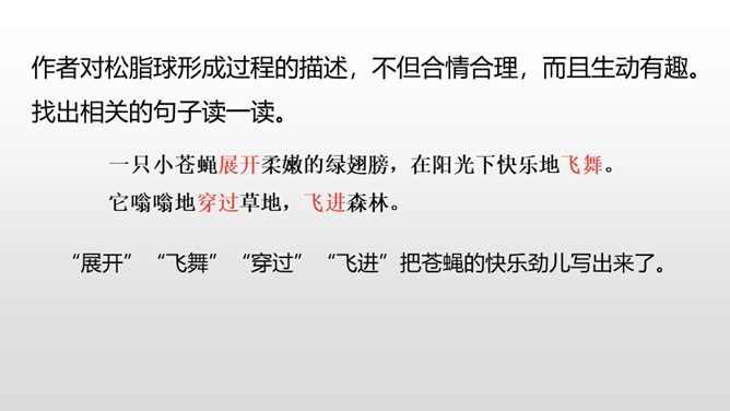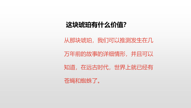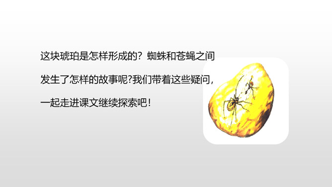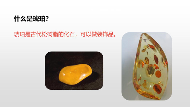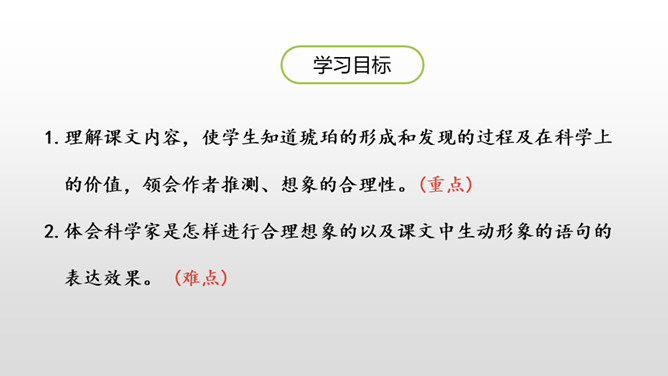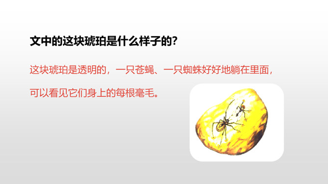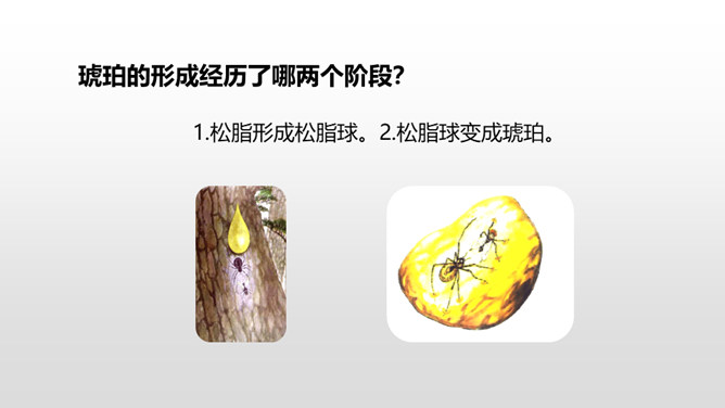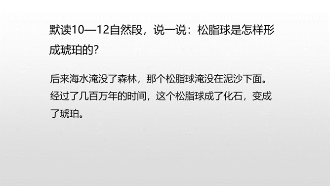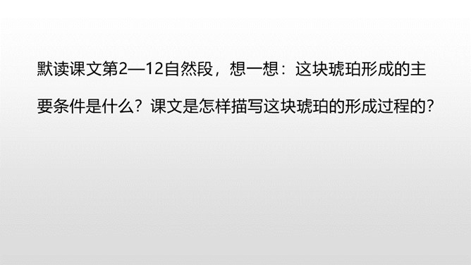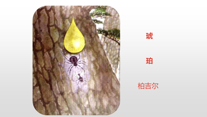 1.理解课文内容,使学生知道琥珀的形成和发现的过程及在科学上的价值,领会作者推测、想象的合理性。(重点)2.体会科学家是怎样进行合理想象的以及课文中生动形象的语句的表达效果。 (难点)默读课文第2—12自然段,想一想:这块琥珀形成的主要条件是什么?课文是怎样描写这块琥珀的形成过程的?课文中有几处是描写太阳的,各是怎样写的,气温的变化集中在哪三个词上?有三处:1.一个夏日,太阳暖暖地照着。2.太阳照得火热。3.晌午的太阳热辣辣地照射着整个树林。暖暖、火热、热辣辣,阳光热度的变化说明天气很炎热。所属专题:琥珀ppt。