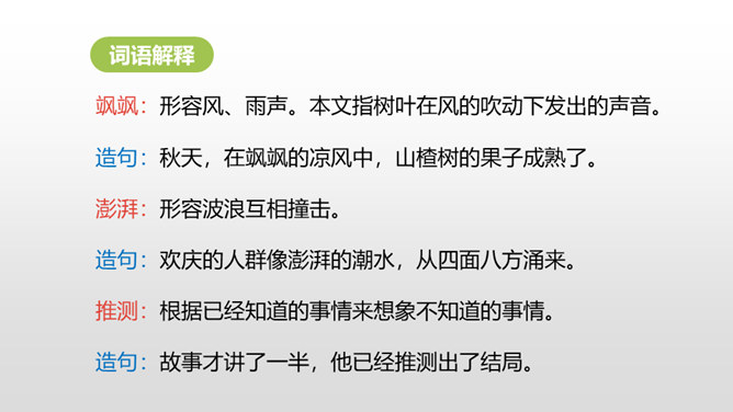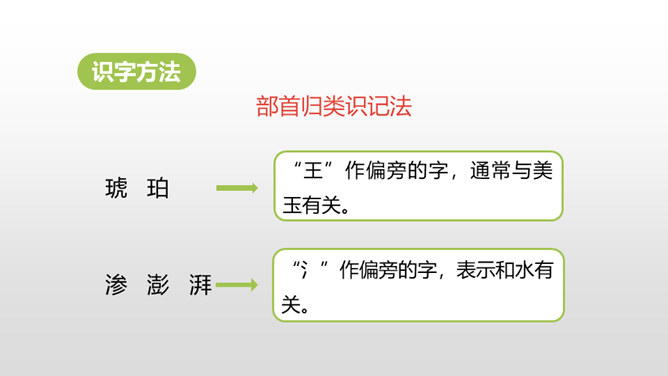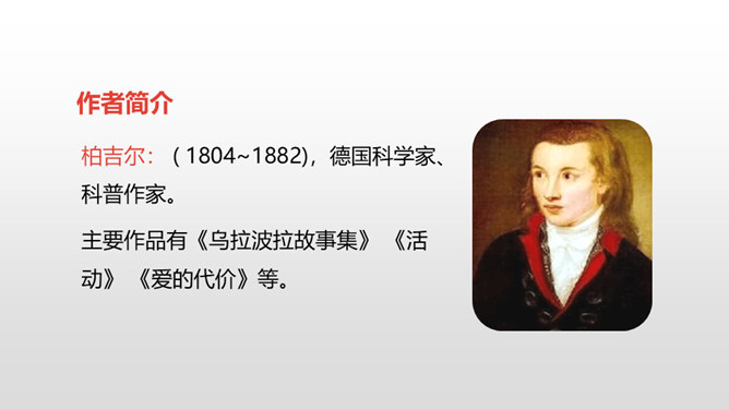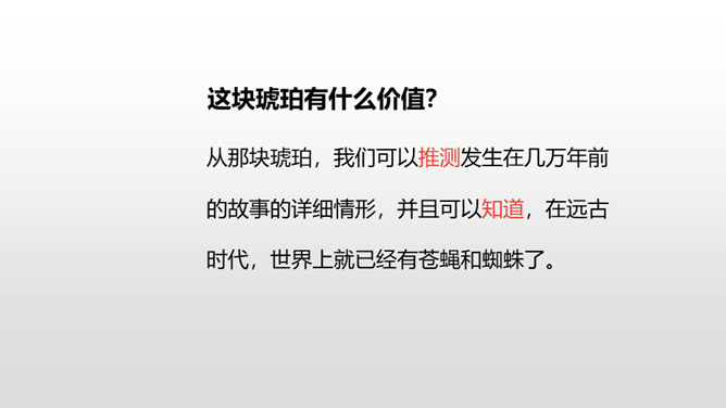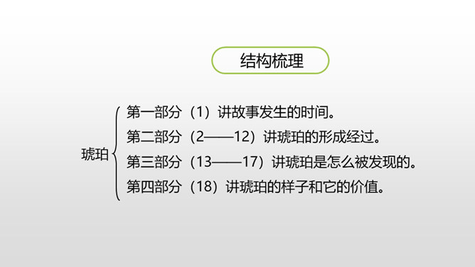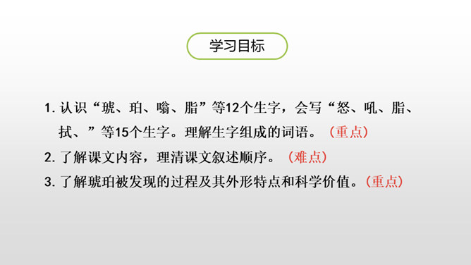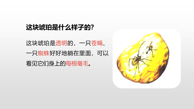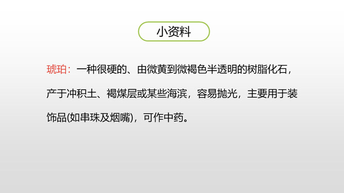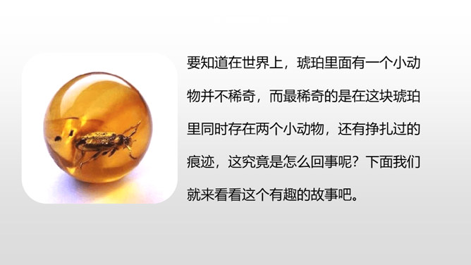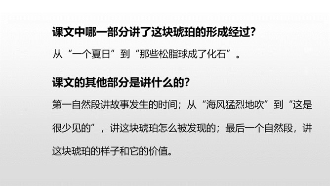 认真阅读课文,想一想,这块琥珀是什么样子的,它是怎么形成的,它有什么价值?课文中哪一部分讲了这块琥珀的形成经过?从“一个夏日”到“那些松脂球成了化石”。课文的其他部分是讲什么的?第一自然段讲故事发生的时间;从“海风猛烈地吹”到“这是很少见的”,讲这块琥珀怎么被发现的;最后一个自然段,讲这块琥珀的样子和它的价值。了解课文内容,理清课文叙述顺序。了解琥珀被发现的过程及其外形特点和科学价值。所属专题:琥珀ppt。