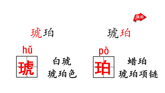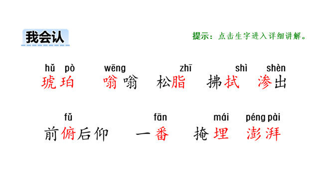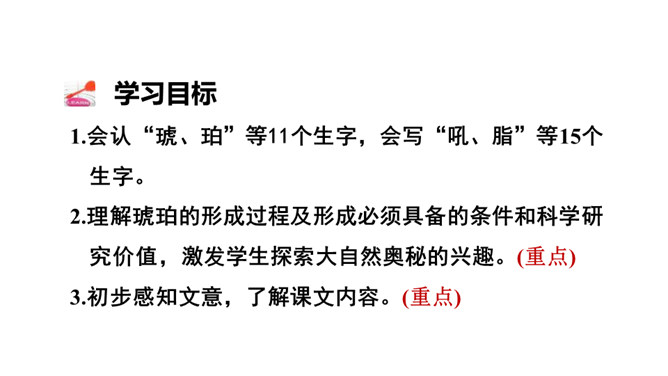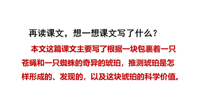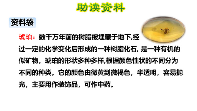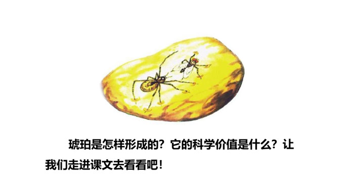 理解琥珀的形成过程及形成必须具备的条件和科学研究价值,激发学生探索大自然奥秘的兴趣。(重点)初步感知文意,了解课文内容。(重点)会认“琥、珀”等11个生字,会写“吼、脂”等15个生字。琥珀是怎样形成的?它的科学价值是什么?让我们走进课文去看看吧!本文这篇课文主要写了根据一块包裹着一只苍蝇和一只蜘蛛的奇异的琥珀,推测琥珀是怎样形成的、发现的,以及这块琥珀的科学价值。所属专题:琥珀ppt。