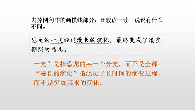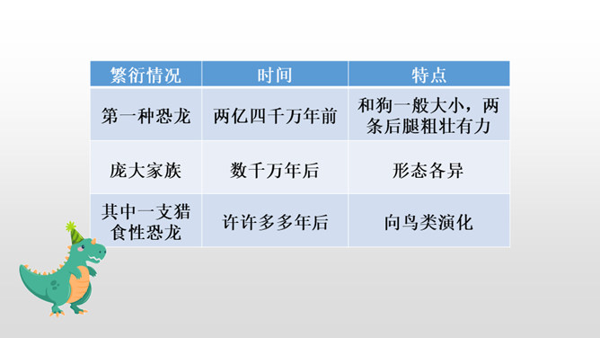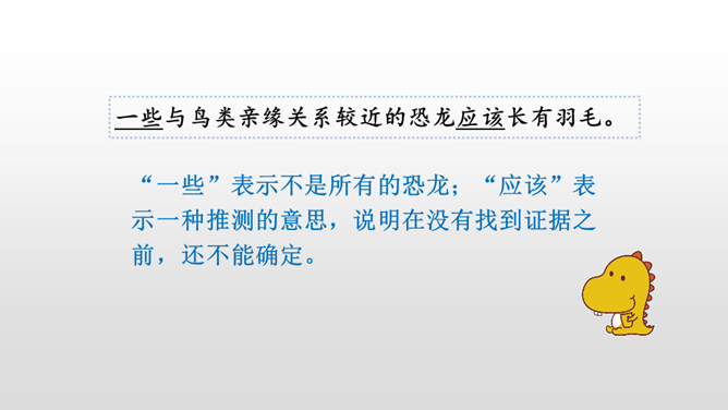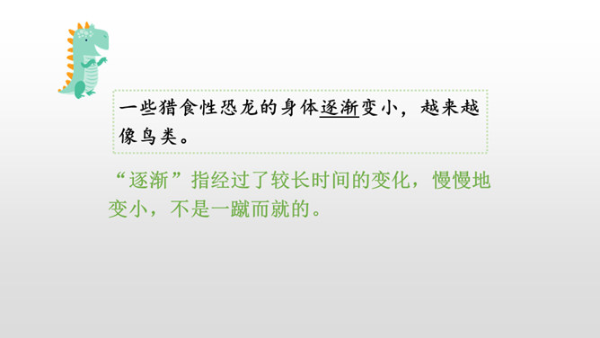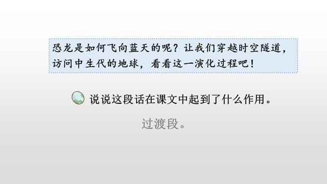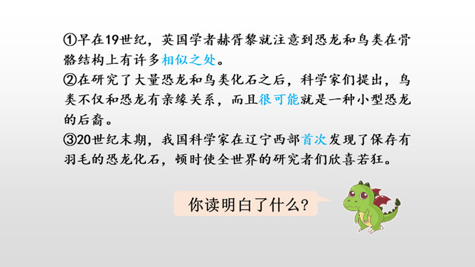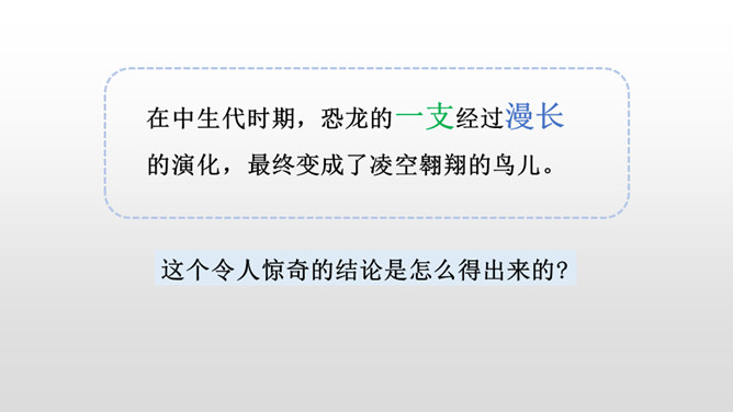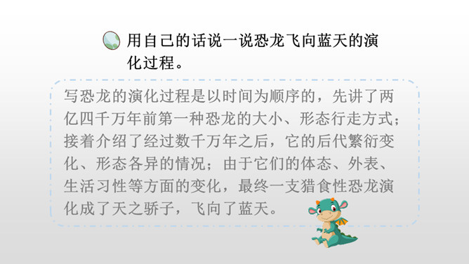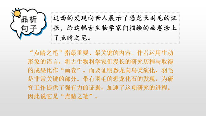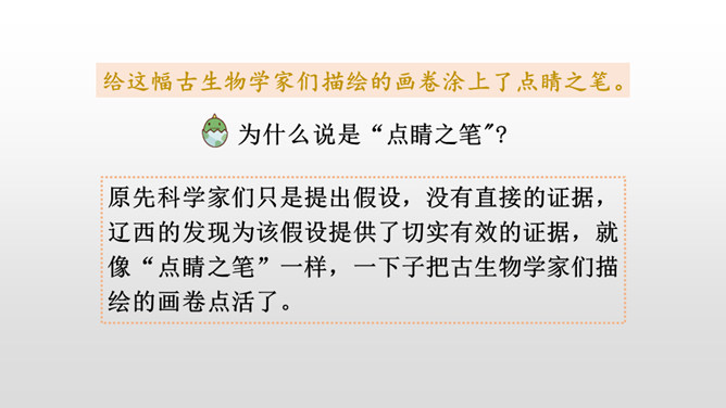 为什么说是“点睛之笔"? 原先科学家们只是提出假设,没有直接的证据,辽西的发现为该假设提供了切实有效的证据,就像“点睛之笔”一样,一下子把古生物学家们描绘的画卷点活了。用自己的话说一说恐龙飞向蓝天的演化过程。写恐龙的演化过程是以时间为顺序的,先讲了两亿四千万年前第一种恐龙的大小、形态行走方式;接着介绍了经过数千万年之后,它的后代繁衍变化、形态各异的情况;由于它们的体态、外表、生活习性等方面的变化,最终一支猎食性恐龙演化成了天之骄子,飞向了蓝天。所属专题:飞向蓝天的恐龙ppt。