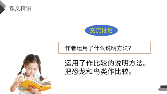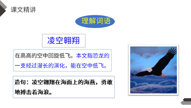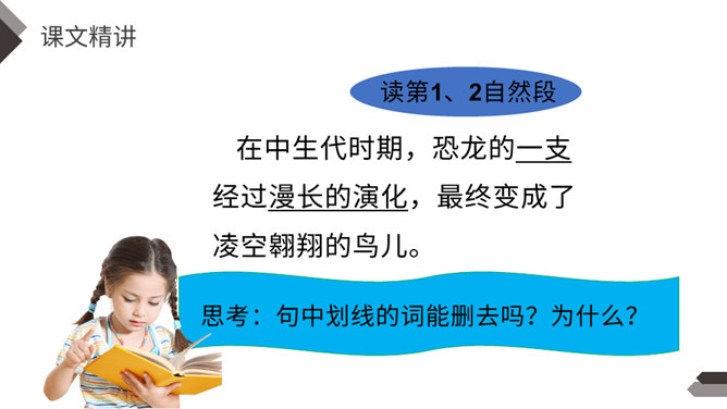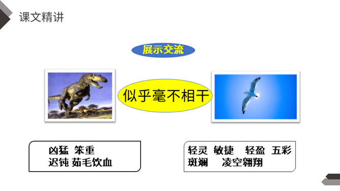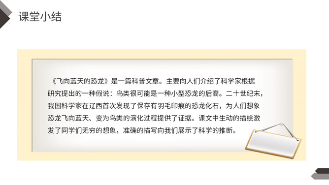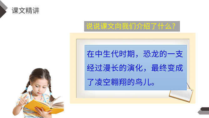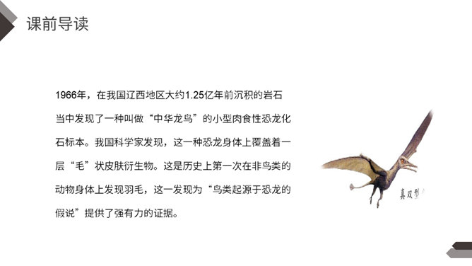 《飞向蓝天的恐龙》是一篇科普文章。主要向人们介绍了科学家根据研究提出的一种假说:鸟类很可能是一种小型恐龙的后裔。二十世纪末,我国科学家在辽西首次发现了保存有羽毛印痕的恐龙化石,为人们想象恐龙飞向蓝天、变为鸟类的演化过程提供了证据。课文中生动的描绘激发了同学们无穷的想象,准确的描写向我们展示了科学的推断。 思考:句中划线的词能删去吗?为什么?运用了作比较的说明方法。把恐龙和鸟类作比较。所属专题:飞向蓝天的恐龙ppt。