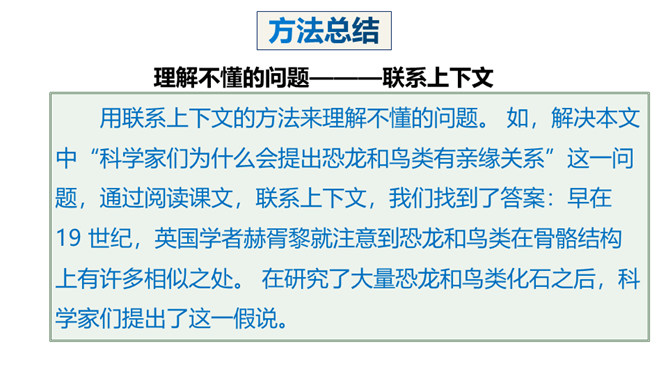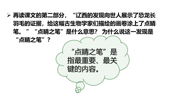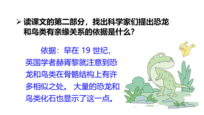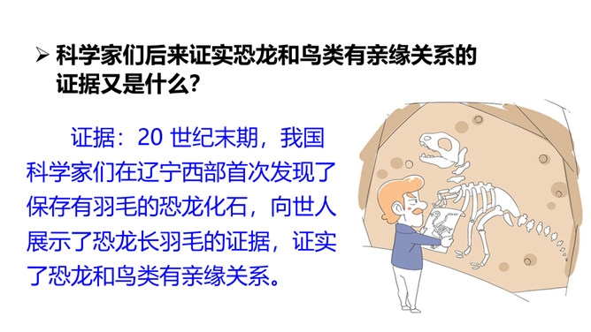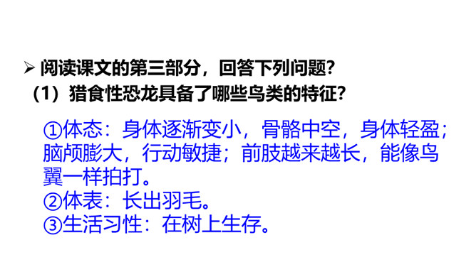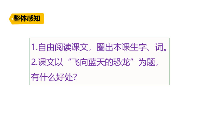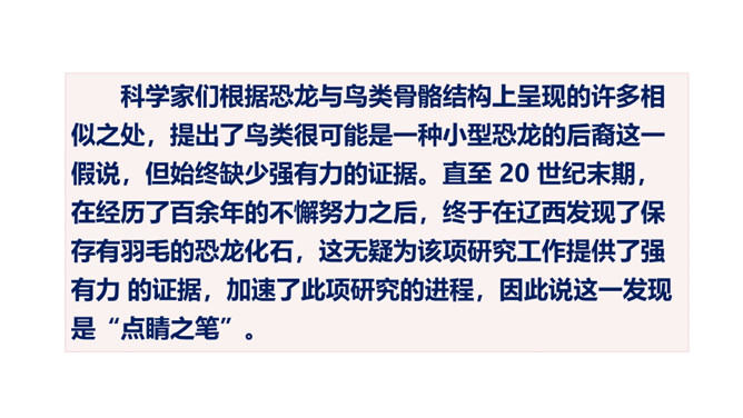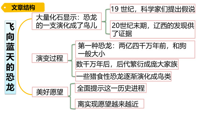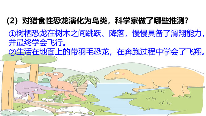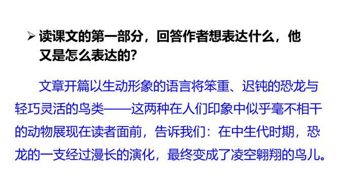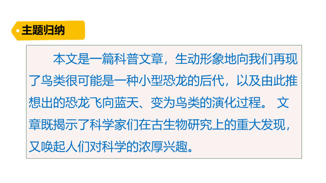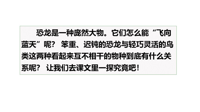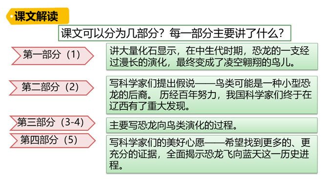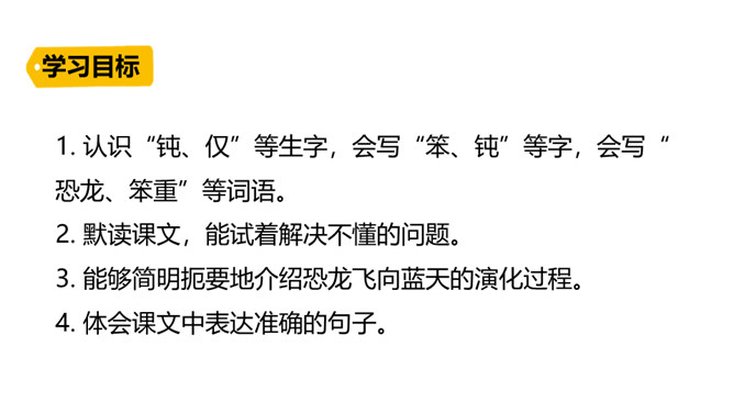 熟读课文,会认会写课文中的生字词,体会课文中表达准确的句子。能够用自己的话介绍恐龙飞向蓝天的演化过程。体会:“全面”是指科学家们希望继续深入探索,搜集到更多的化石、更丰富的资料,力争通过科学技术手段将其演变的过程全面具体、形象直观地展示在世人面前。体会:“一支”指的是恐龙的某一个分支,而不是全部;“漫长的演化”是指经历了长时间的演变过程,而不是突如其来的变化。所属专题:飞向蓝天的恐龙ppt。