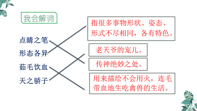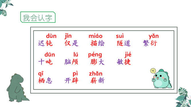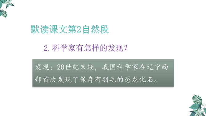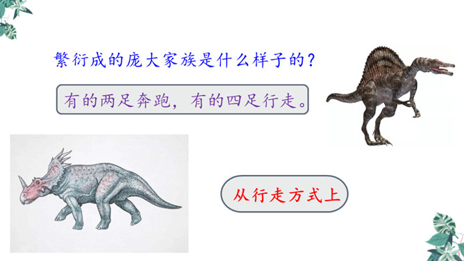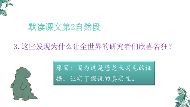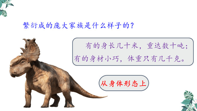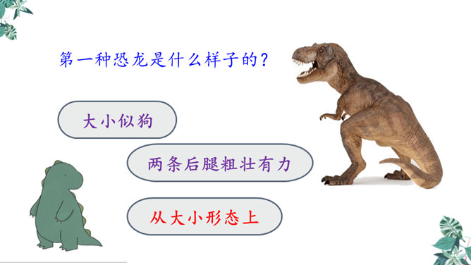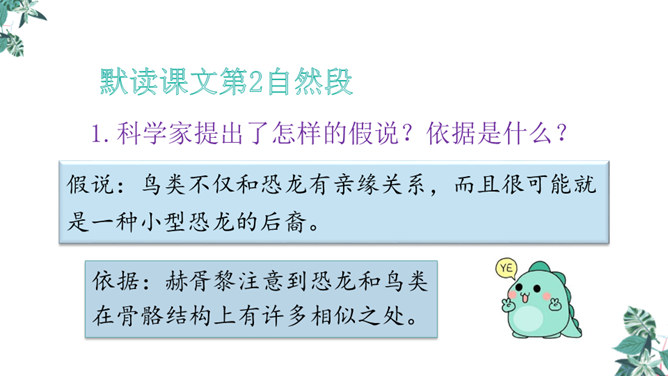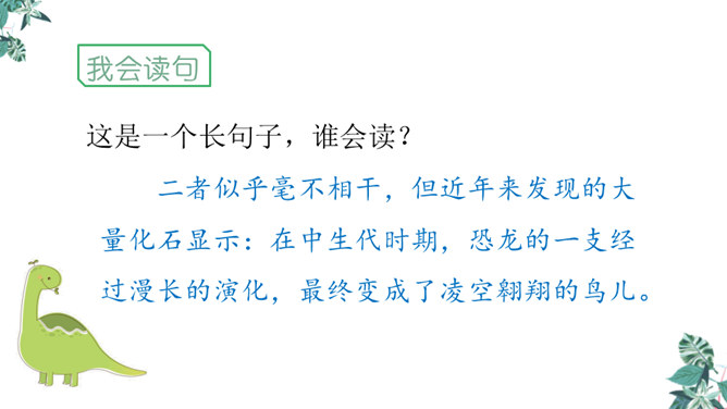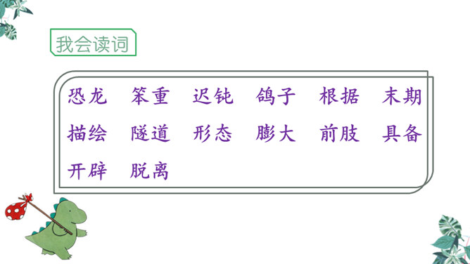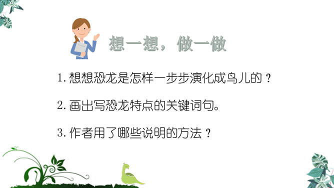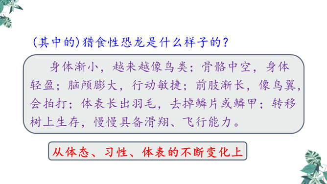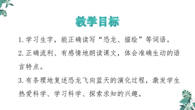 1.学习生字,能正确读写“恐龙、描绘”等词语。2.正确流利、有感情地朗读课文,体会准确生动的语言特点。3.有条理地复述恐龙飞向蓝天的演化过程,激发学生热爱科学、学习科学、探索求知的兴趣。1.想想恐龙是怎样一步步演化成鸟儿的?2.画出写恐龙特点的关键词句。3.作者用了哪些说明的方法?科学家提出了怎样的假说?依据是什么?依据:赫胥黎注意到恐龙和鸟类在骨骼结构上有许多相似之处。所属专题:飞向蓝天的恐龙ppt。