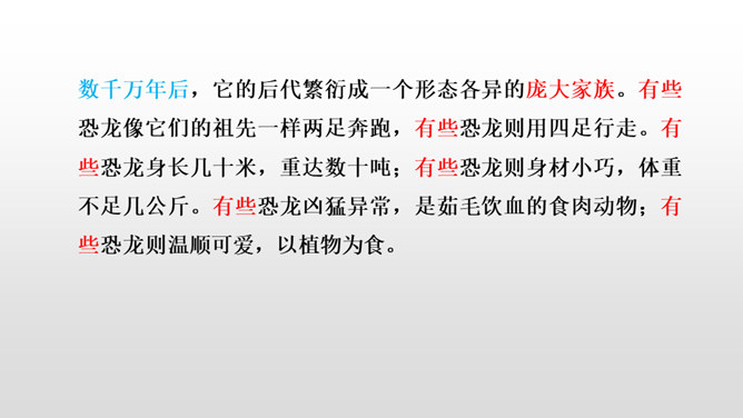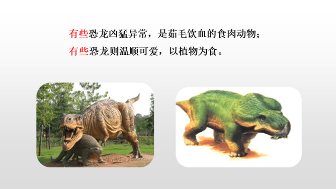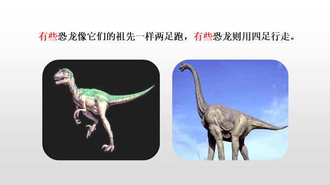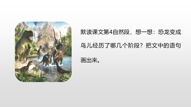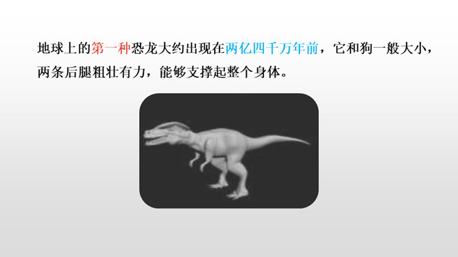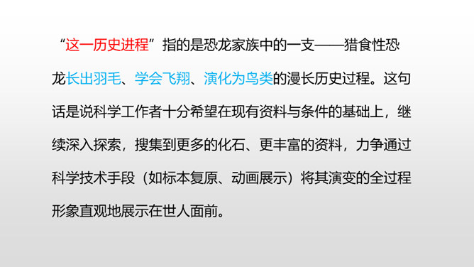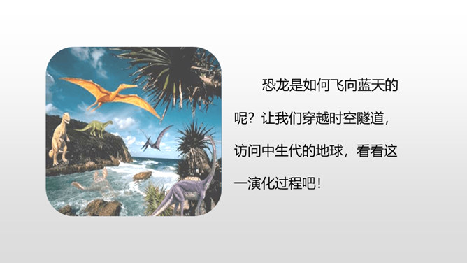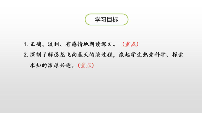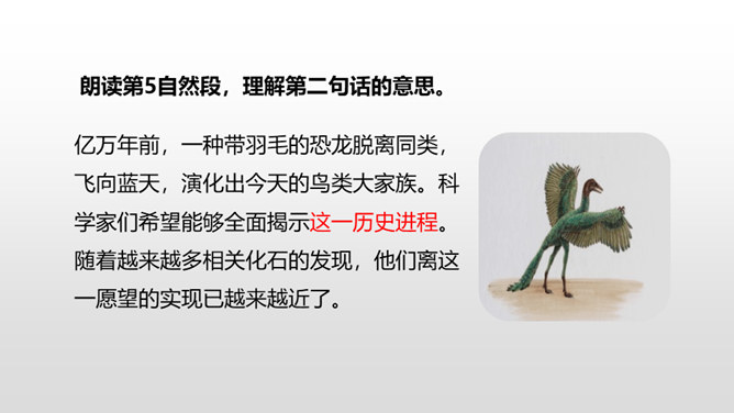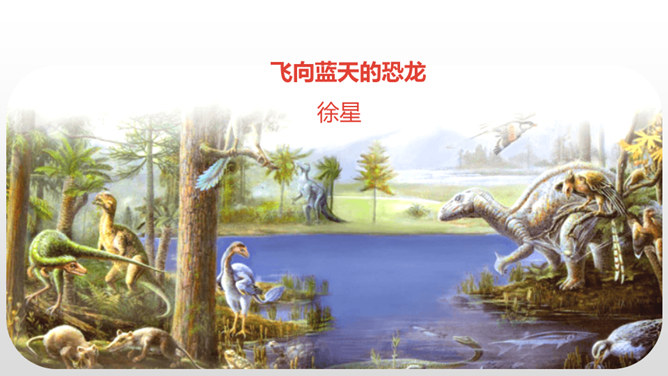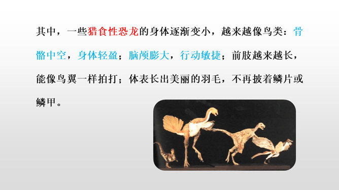 1.正确、流利、有感情地朗读课文。 (重点)2.深刻了解恐龙飞向蓝天的演过程,激起学生热爱科学、探索求知的浓厚兴趣。(重点)默读课文第4自然段,想一想:恐龙变成鸟儿经历了哪几个阶段?把文中的语句画出来。 作者巧用“骨骼中空,身体轻盈;脑颅膨大,行动敏捷”等四字词语,具体生动地介绍了猎食性恐龙的仪态、体表等方面的变化,想象合理,条理清晰。朗读第5自然段,理解第二句话的意思。所属专题:飞向蓝天的恐龙ppt。