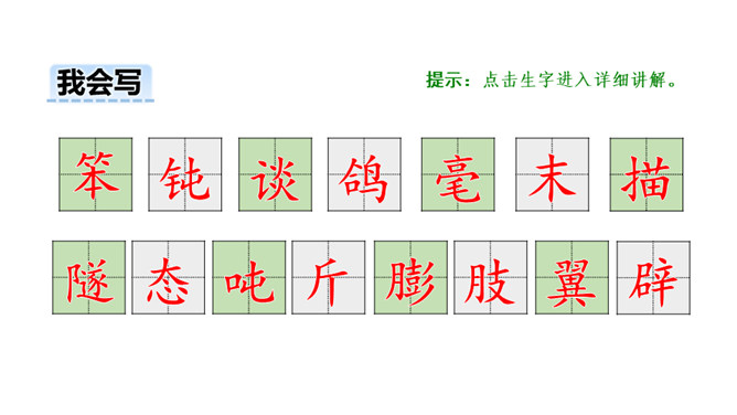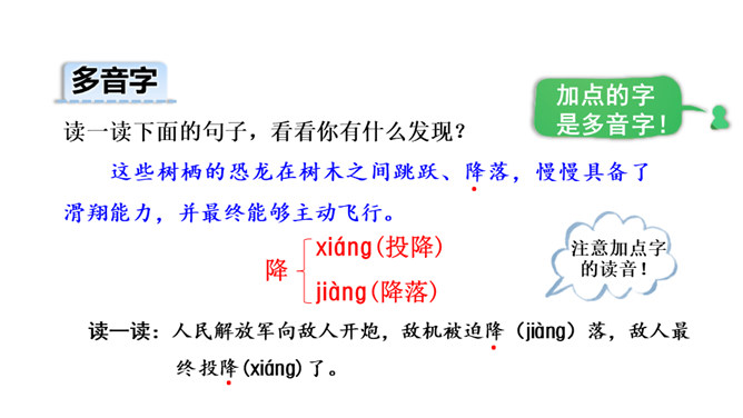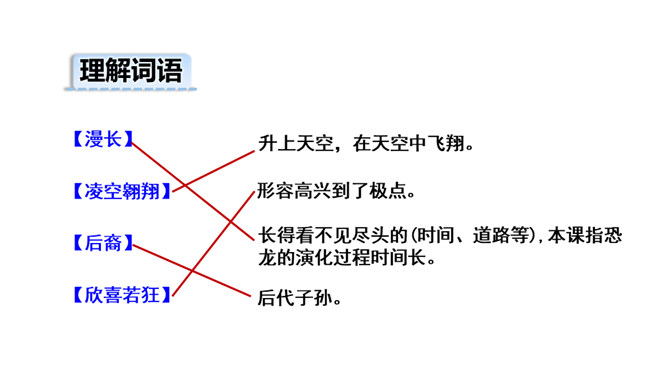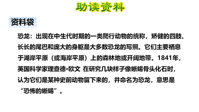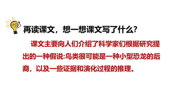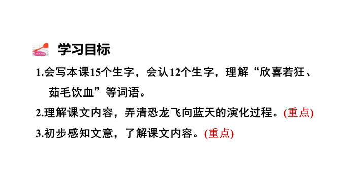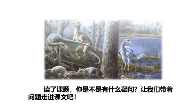 读了课题,你是不是有什么疑问?让我们带着问题走进课文吧!1.会写本课15个生字,会认12个生字,理解“欣喜若狂、茹毛饮血”等词语。2.理解课文内容,弄清恐龙飞向蓝天的演化过程。(重点)3.初步感知文意,了解课文内容。(重点)请同学们自由朗读课文,注意读准字音,读通句子,难读的地方多读几遍。课文主要向人们介绍了科学家们根据研究提出的一种假说:鸟类很可能是一种小型恐龙的后裔,以及一些证据和演化过程的推理。所属专题:飞向蓝天的恐龙ppt。