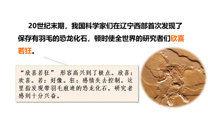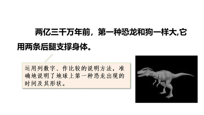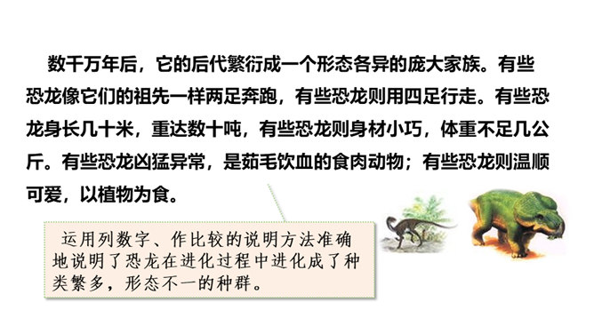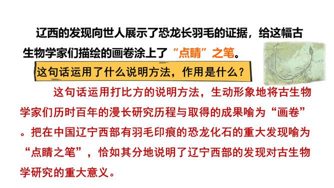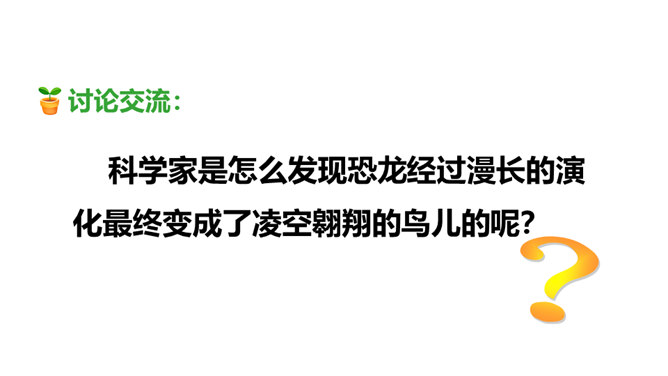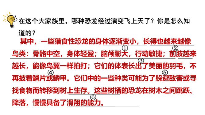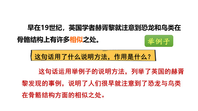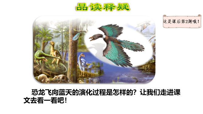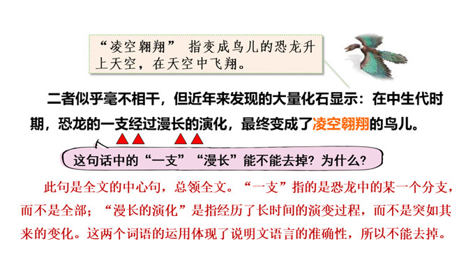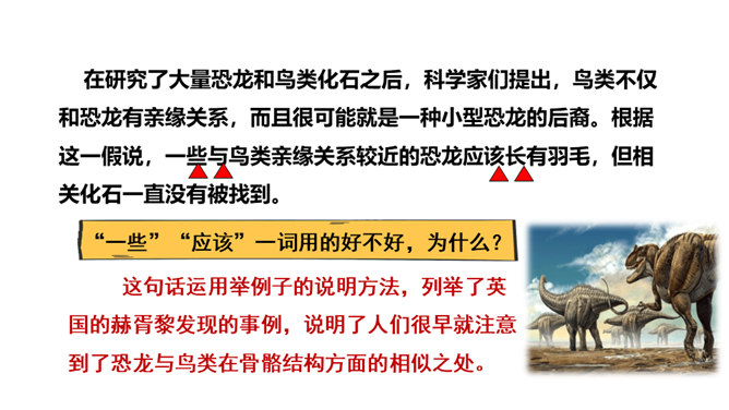 这句话中的“一支”“漫长”能不能去掉? 为什么?此句是全文的中心句,总领全文。“一支”指的是恐龙中的某一个分支,而不是全部;“漫长的演化”是指经历了长时间的演变过程,而不是突如其来的变化。这两个词语的运用体现了说明文语言的准确性,所以不能去掉。这句话用了什么说明方法,作用是什么?这句话运用举例子的说明方法,列举了英国的赫胥黎发现的事例,说明了人们很早就注意到了恐龙与鸟类在骨骼结构方面的相似之处。所属专题:飞向蓝天的恐龙ppt。