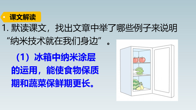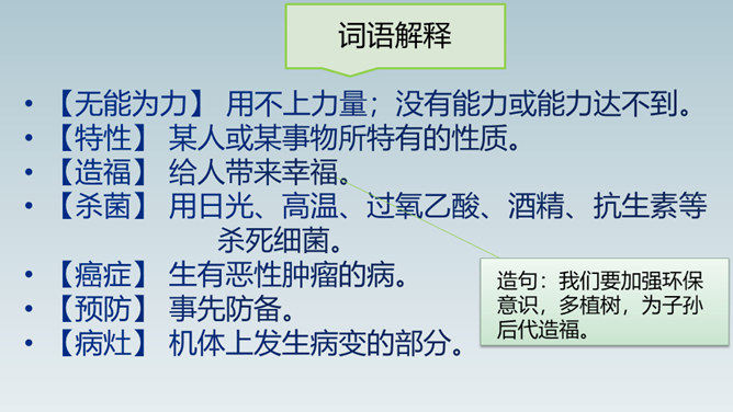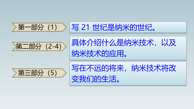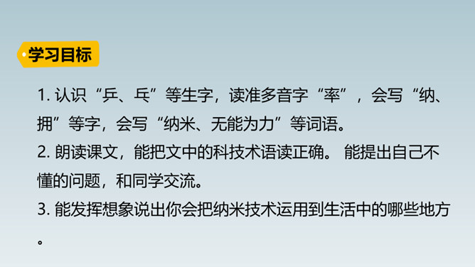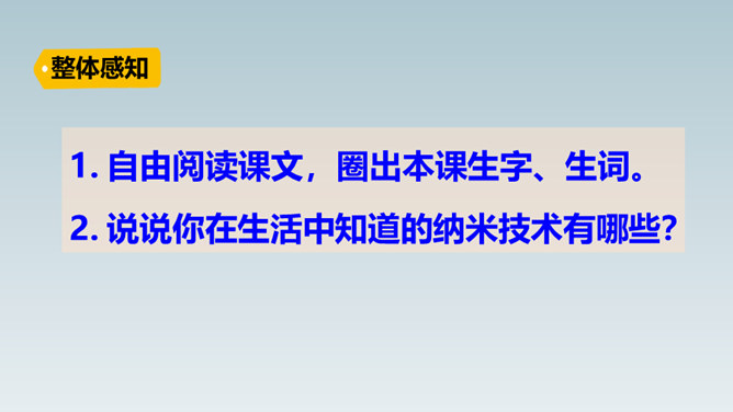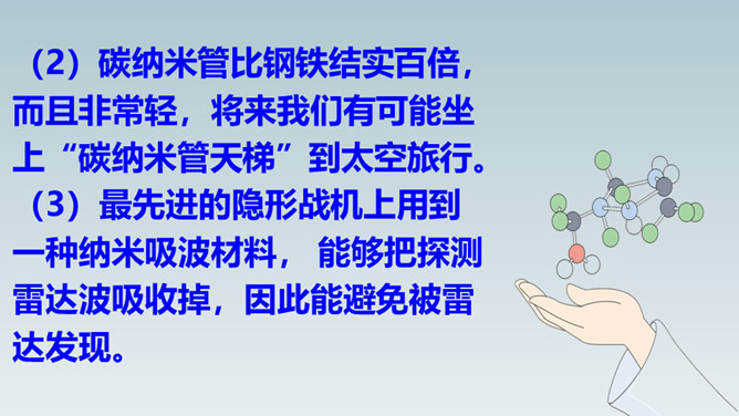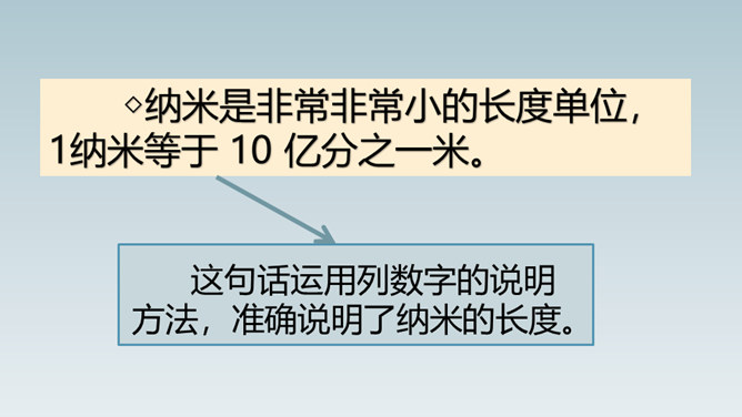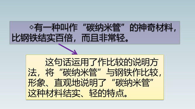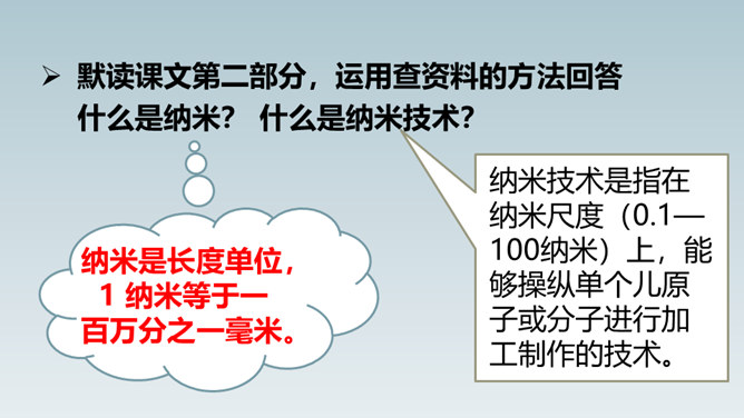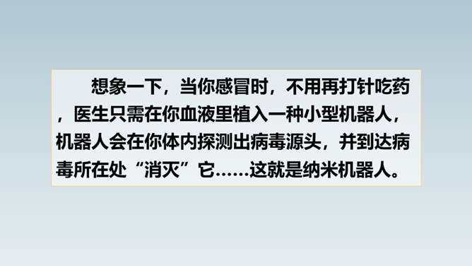 想象一下,当你感冒时,不用再打针吃药,医生只需在你血液里植入一种小型机器人,机器人会在你体内探测出病毒源头,并到达病毒所在处“消灭”它……这就是纳米机器人。这句话运用了作比较的说明方法,将“碳纳米管”与钢铁作比较,形象、直观地说明了“碳纳米管”这种材料结实、轻的特点。这句话运用作比较的说明方法,形象、生动、直观地说明了纳米是多么小的一个长度单位。所属专题:纳米技术就在我们身边ppt。