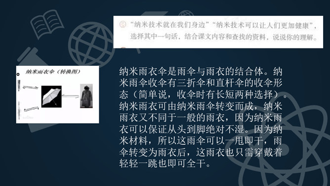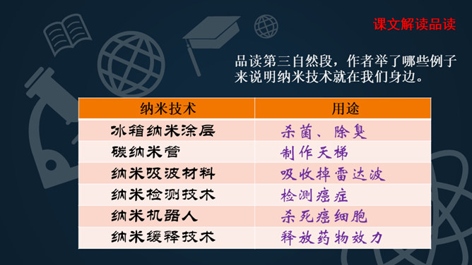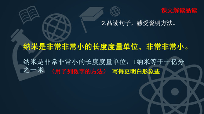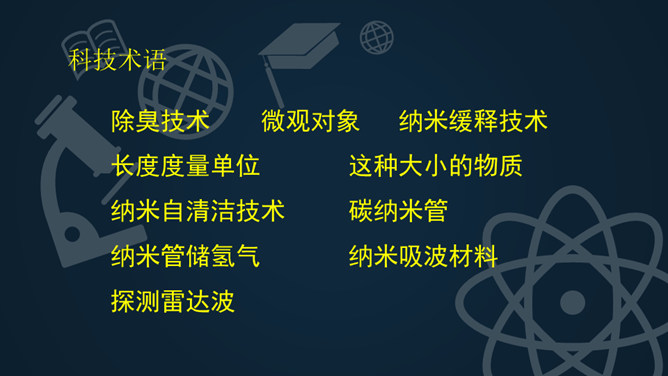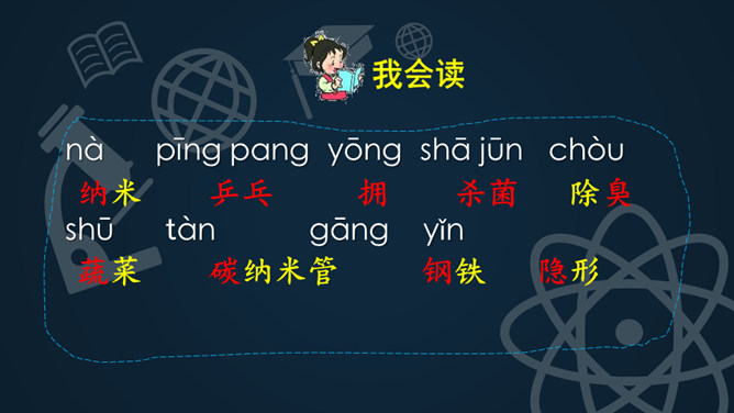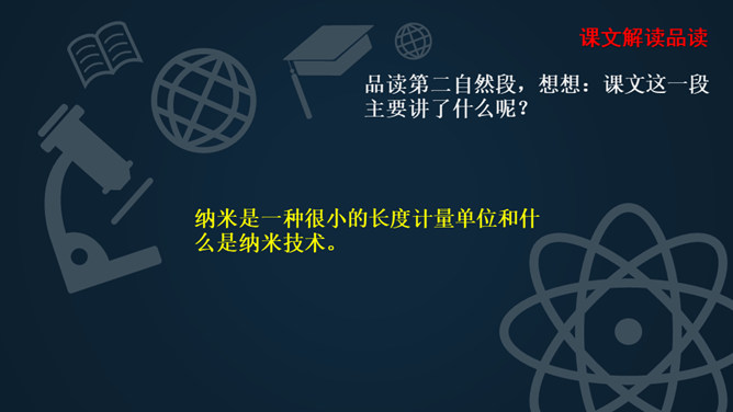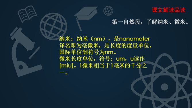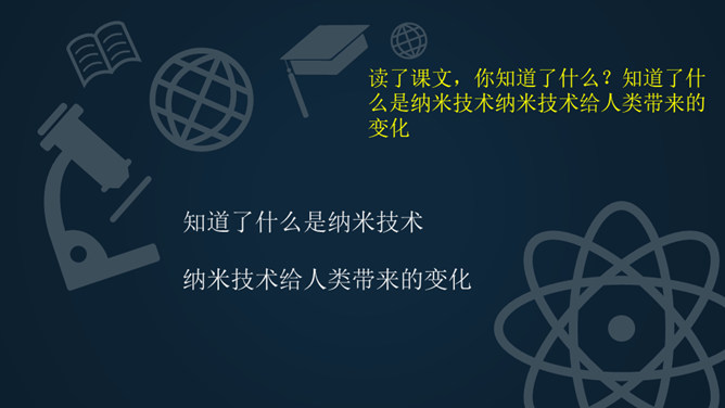 朗读课文,把文中的科技术语读正确。把我会认,我会写的字在原文找出来,和小组一起解决。读完课文,你有什么疑问?提出来和同学交流。读了课文,你知道了什么?知道了什么是纳米技术纳米技术给人类带来的变化。知道了什么是纳米技术,纳米技术给人类带来的变化。读第二自然段,想想:课文这一段主要讲了什么呢?纳米是一种很小的长度计量单位和什么是纳米技术。所属专题:纳米技术就在我们身边ppt。