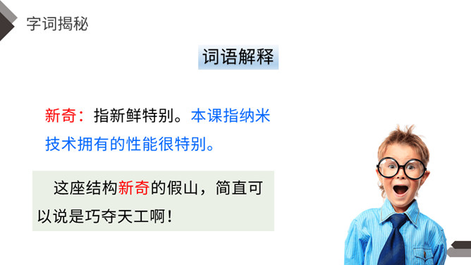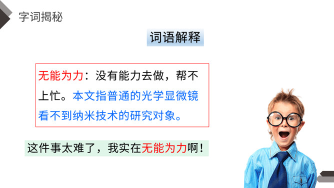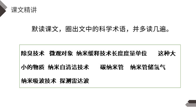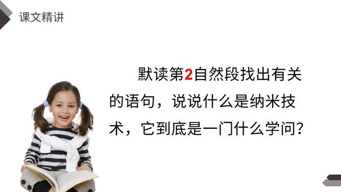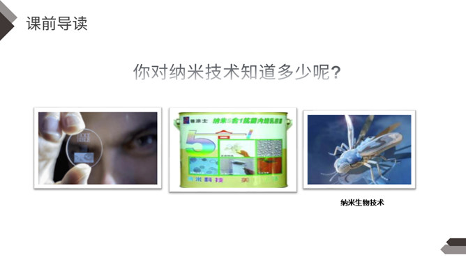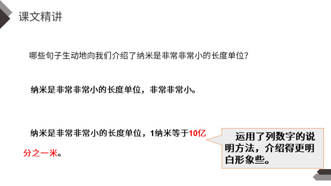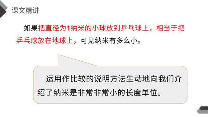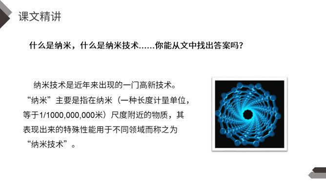 默读第2自然段找出有关的语句,说说什么是纳米技术,它到底是一门什么学问?哪些句子生动地向我们介绍了纳米是非常非常小的长度单位?运用了列数字的说明方法,介绍得更明白形象些。运用作比较的说明方法生动地向我们介绍了纳米是非常非常小的长度单位。第二自然段是围绕哪句话来写的?这个自然段的结构有什么特点?纳米技术将给人类的生活带来深刻的变化。纳米技术带来变化。所属专题:纳米技术就在我们身边ppt。