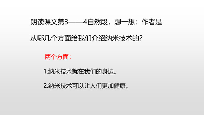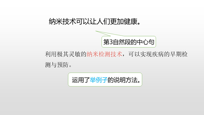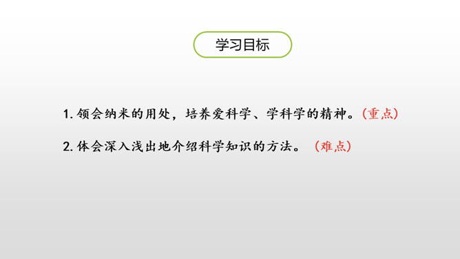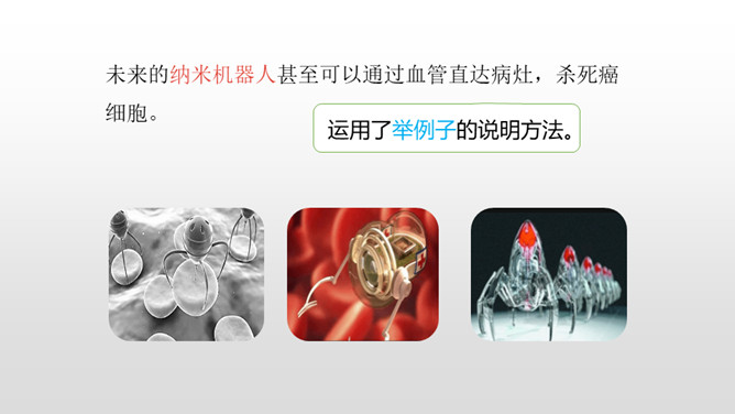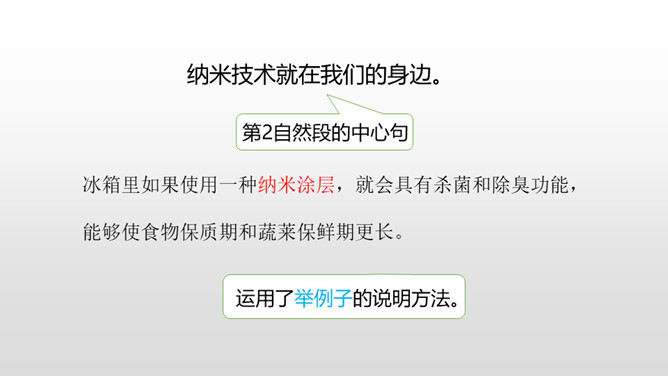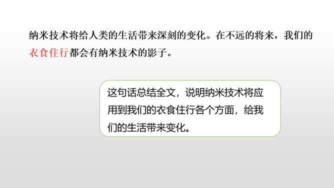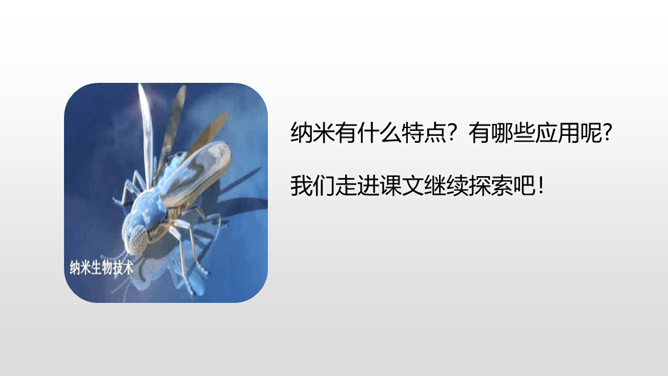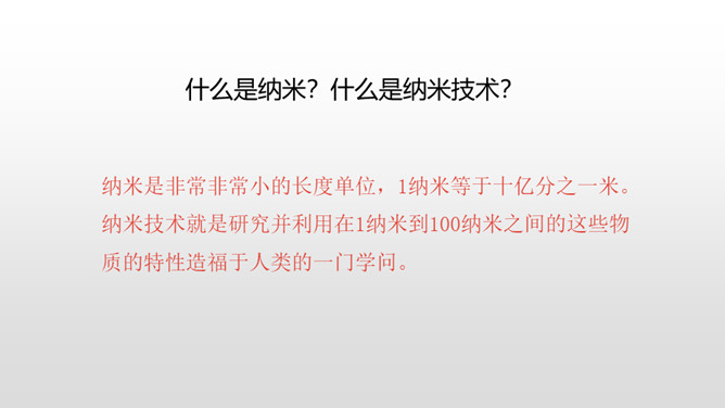 本文是一篇科普知识的小品文,介绍了高新科技纳米技术,它既在我们的身边,又用在其他各个方面,比如材料学、医学等,纳米技术可以改变我们人类的衣食住行,让我们感知了纳米技术的神奇和科学的神奇。科学小品文也称知识小品或文艺性说明文。它用小品文的笔调,即借助某些文学写作手法,将科学内容生动、形象地表达出来。经常运用一些说明方法,比如列数字、下定义、打比方、举例子、作比较等方法。特点:一般短小精悍、通俗易懂、语言丰富多彩,形式生动活泼。所属专题:纳米技术就在我们身边ppt。