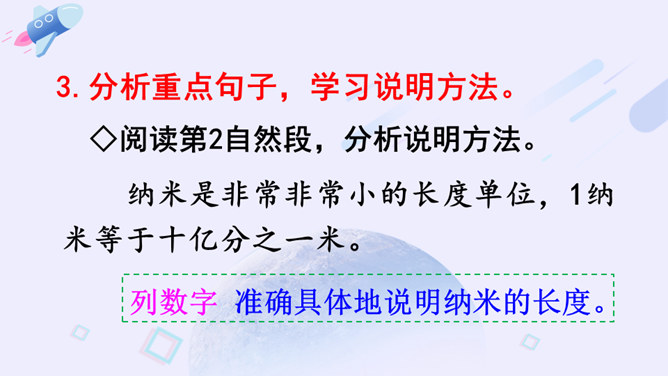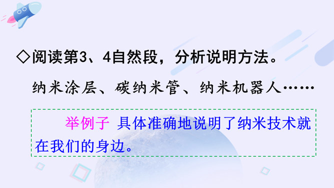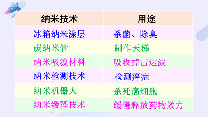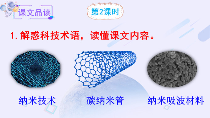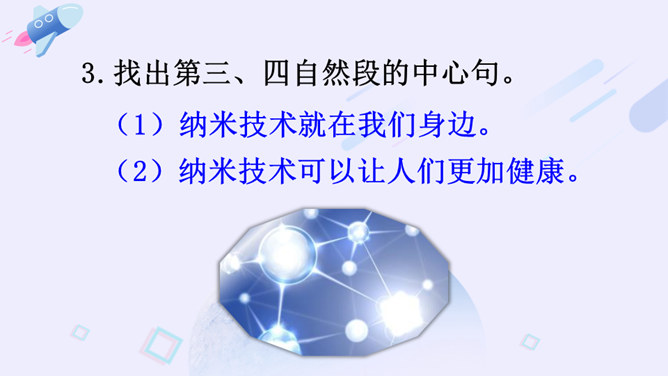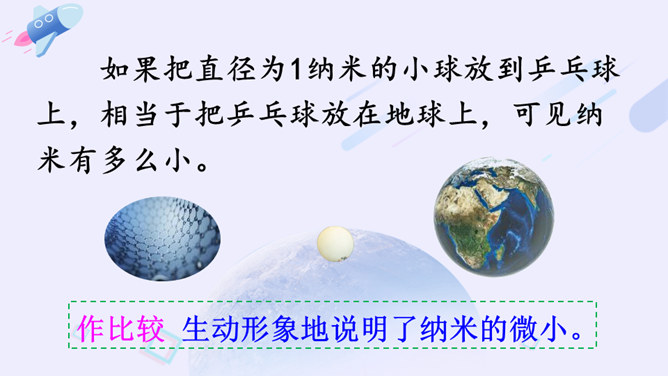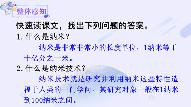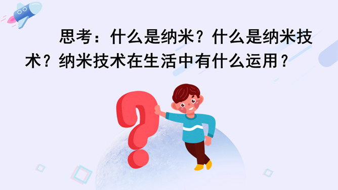 思考:什么是纳米?什么是纳米技术?纳米技术在生活中有什么运用?快速读课文,找出下列问题的答案。1.什么是纳米?纳米是非常非常小的长度单位,1纳米等于十亿分之一米。结合你搜集的有关纳米技术的资料,仿照本课总分结构的段落特点,运用本课学到的说明方法,写一写纳米技术在生活中的广泛应用。本文用简洁的语言向读者介绍了纳米、纳米技术等科学知识,并展示了纳米时代纳米技术美妙的应用前景。所属专题:纳米技术就在我们身边ppt。