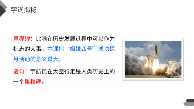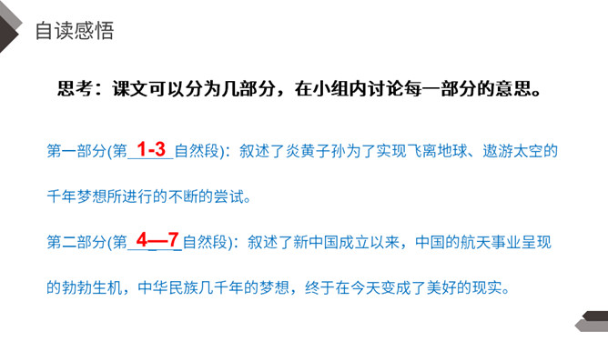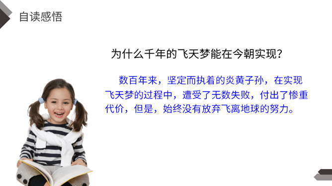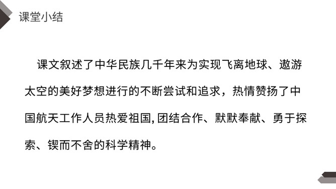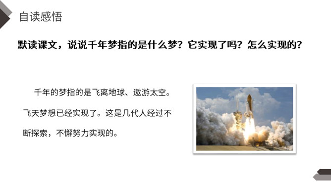 同学们,让我们跨越历史长河,穿越时间隧道,乘上时空飞船,一起去追寻中华民族的飞天梦吧!默读课文,说说千年梦指的是什么梦?它实现了吗?怎么实现的?千年的梦指的是飞离地球、遨游太空。飞天梦想已经实现了。这是几代人经过不断探索,不懈努力实现的。课文叙述了中华民族几千年来为实现飞离地球、遨游太空的美好梦想进行的不断尝试和追求,热情赞扬了中国航天工作人员热爱祖国, 团结合作、默默奉献、勇于探索、锲而不舍的科学精神。所属专题:千年梦圆在今朝ppt。