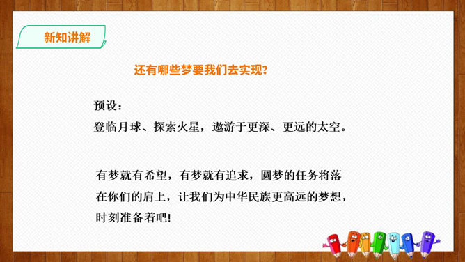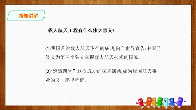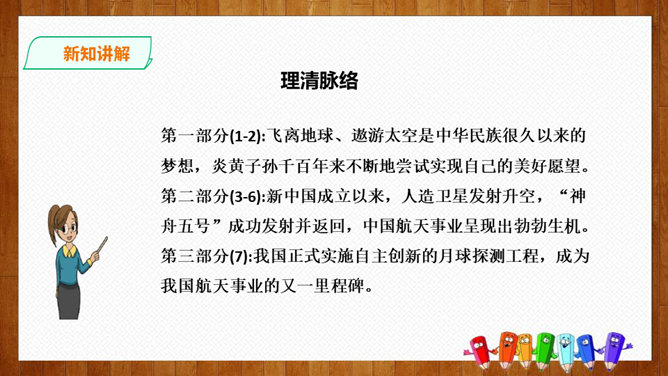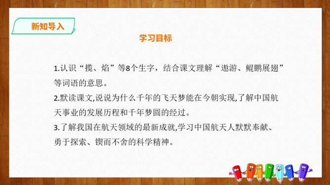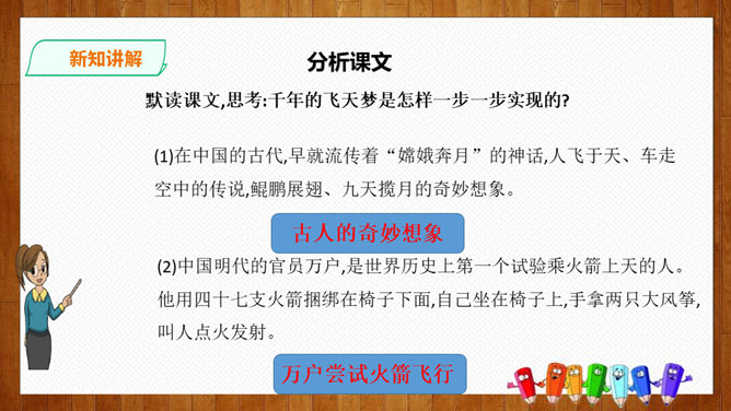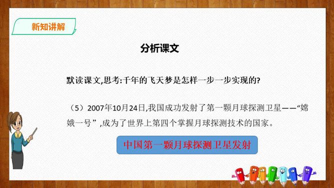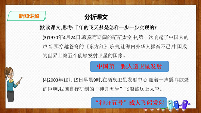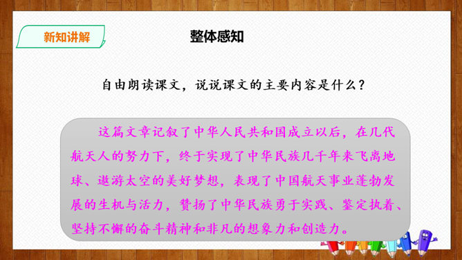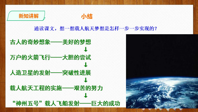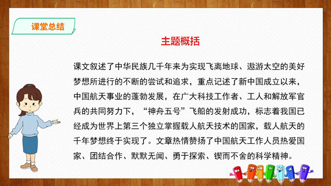 课文叙述了中华民族几千年来为实现飞离地球、遨游太空的美好梦想所进行的不断的尝试和追求,重点记述了新中国成立以来,中国航天事业的蓬勃发展,在广大科技工作者、工人和解放军官兵的共同努力下,“神舟五号”飞船的发射成功,标志着我国已经成为世界上第三个独立掌握载人航天技术的国家,载人航天的千年梦想终于实现了。文章热情赞扬了中国航天工作人员热爱国家、团结合作、默默无闻、勇于探索、锲而不舍的科学精神。所属专题:千年梦圆在今朝ppt。