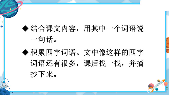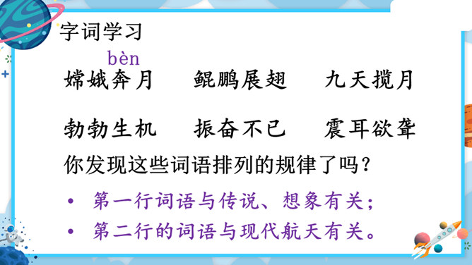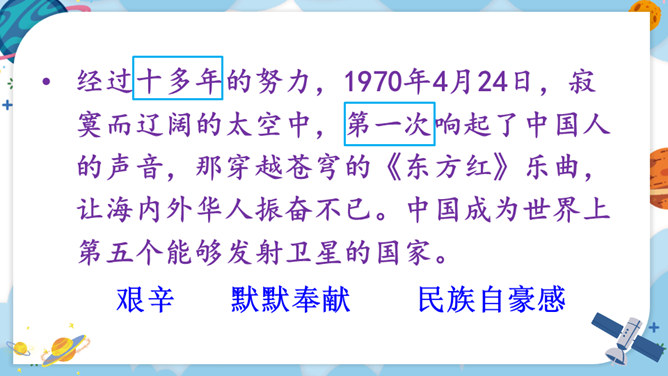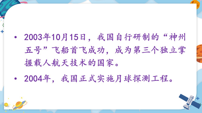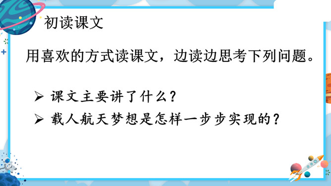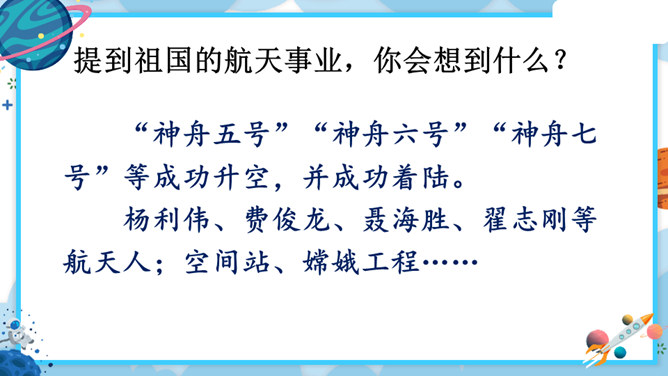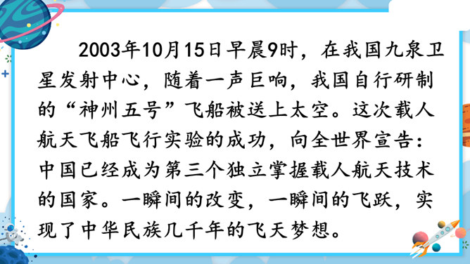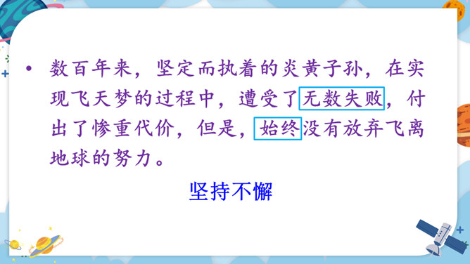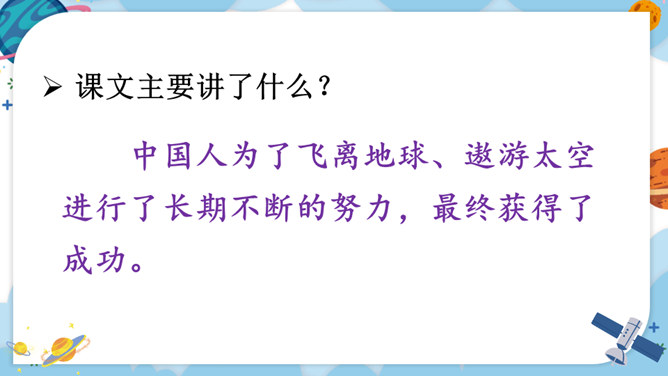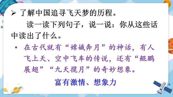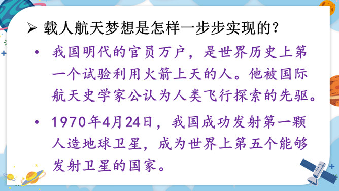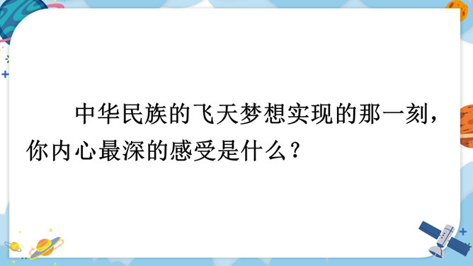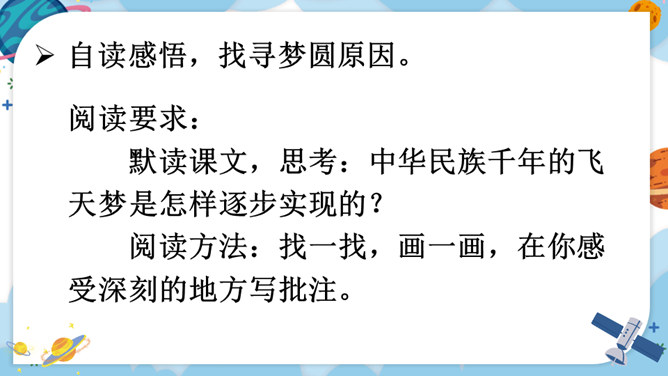 中华民族的飞天梦想实现的那一刻,你内心最深的感受是什么?结合课文内容,用其中一个词语说一句话。积累四字词语。文中像这样的四字词语还有很多,课后找一找,并摘抄下来。课文主要讲了什么?中国人为了飞离地球、遨游太空进行了长期不断的努力,最终获得了成功。阅读要求:默读课文,思考:中华民族千年的飞天梦是怎样逐步实现的?阅读方法:找一找,画一画,在你感受深刻的地方写批注。所属专题:千年梦圆在今朝ppt。
