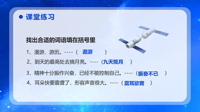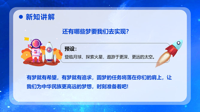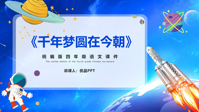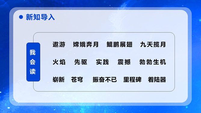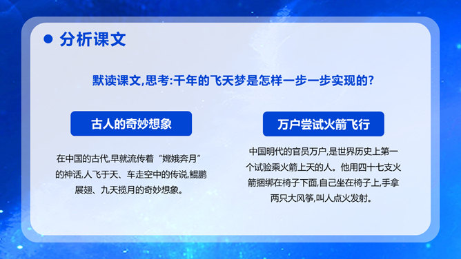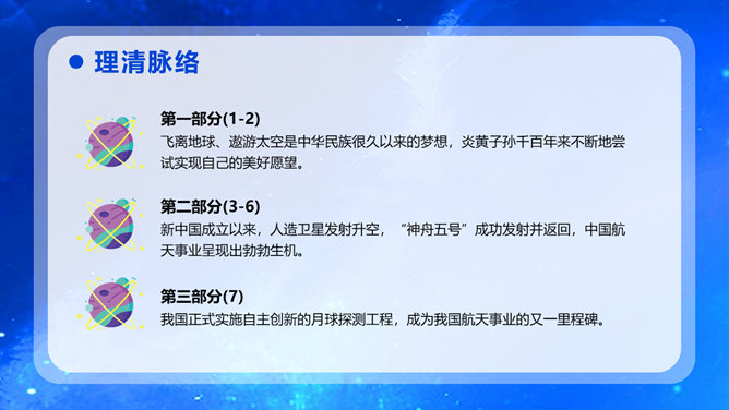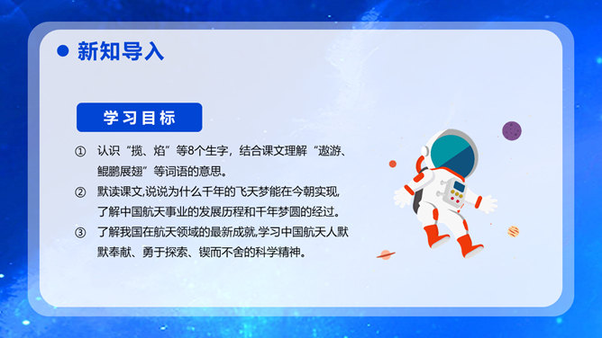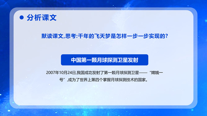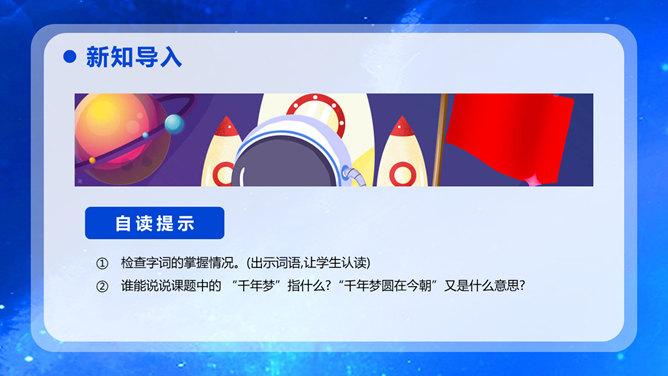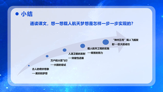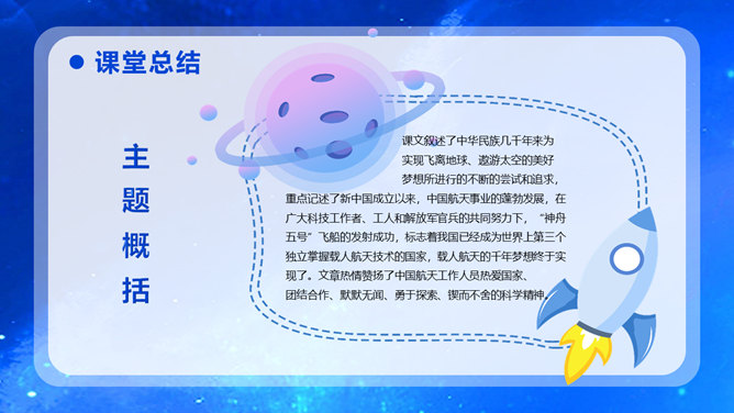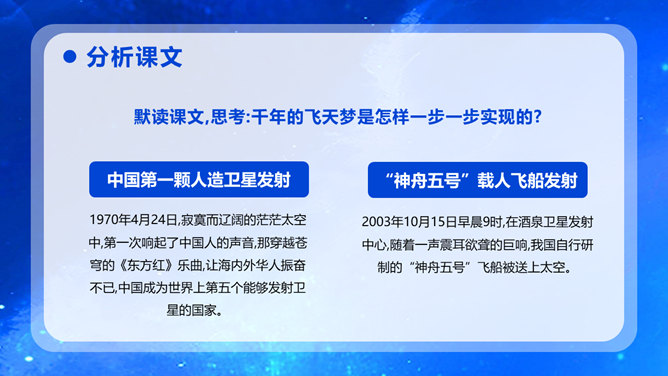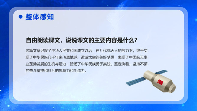 自由朗读课文,说说课文的主要内容是什么?这篇文章记叙了中华人民共和国成立以后,在几代航天人的努力下,终于实现了中华民族几千年来飞离地球、遨游太空的美好梦想,表现了中国航天事业蓬勃发展的生机与活力,赞扬了中华民族勇于实践、鉴定执着、坚持不懈的奋斗精神和非凡的想象力和创造力。了解我国在航天领域的最新成就,学习中国航天人默默奉献、勇于探索、锲而不舍的科学精神。所属专题:千年梦圆在今朝ppt。