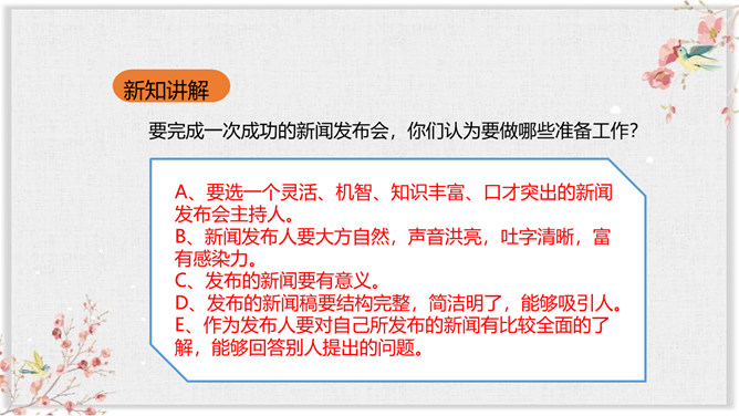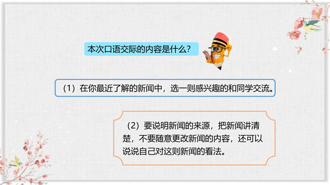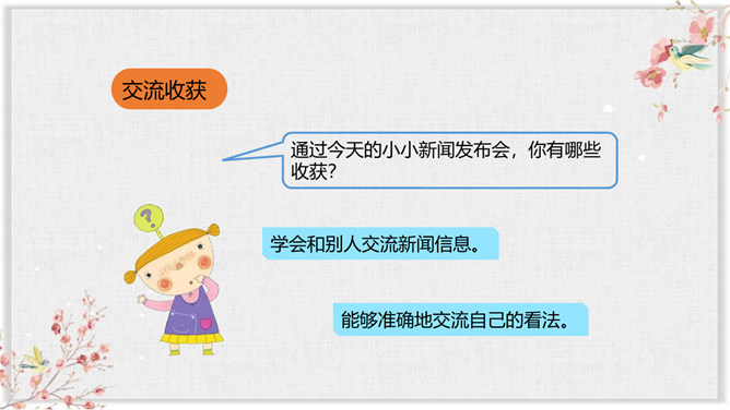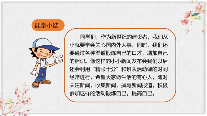 你们平时都是通过什么方式来了解新闻的?读报纸、看电视、听广播、上网,这些方便、快捷的途径,让我们随时都能了解到国内外的新闻,让地球变得越来越小,我们应该关注国内外发生的事情。今天这节课就让我们就来说说自己知道的新闻,召开一次新闻发布会吧! 同学们,作为新世纪的建设者,我们从小就要学会关心国内外大事。同时,我们还要通过各种渠道锻炼自己的口才,增加自己的胆识。像这样的小小新闻发布会我们以后还会利用“精彩十分”和班队活动课的时间经常进行,希望大家做生活的有心人,随时关注新闻,收集新闻,撰写新闻报道,积极参加这样的活动锻炼自己,提高自己。所属专题:说新闻ppt。