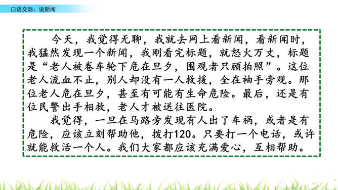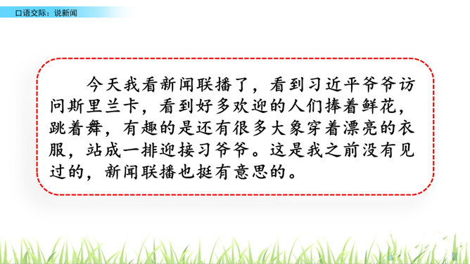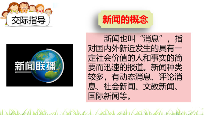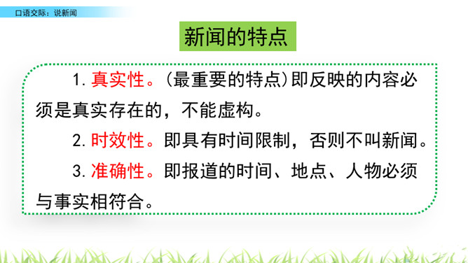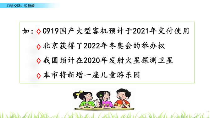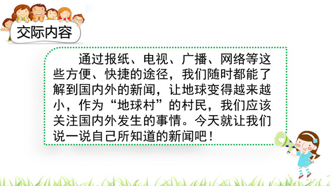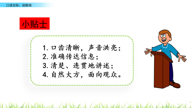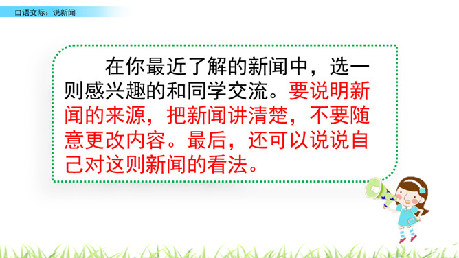 在你最近了解的新闻中,选一则感兴趣的和同学交流。要说明新闻的来源,把新闻讲清楚,不要随意更改内容。最后,还可以说说自己对这则新闻的看法。新闻也叫“消息”,指对国内外新近发生的具有一定社会价值的人和事实的简要而迅速的报道。新闻种类较多,有动态消息、评论消息、社会新闻、文教新闻、国际新闻等。1.口齿清晰,声音洪亮;2.准确传达信息;3.清楚、连贯地讲述;4.自然大方,面向观众。所属专题:说新闻ppt。