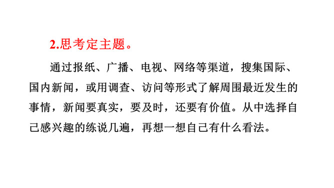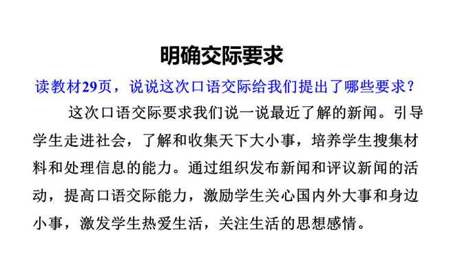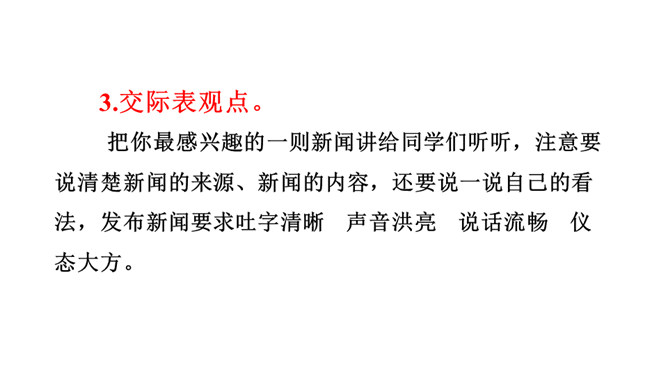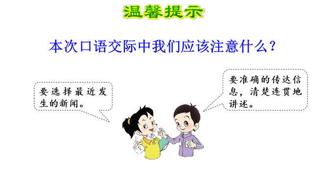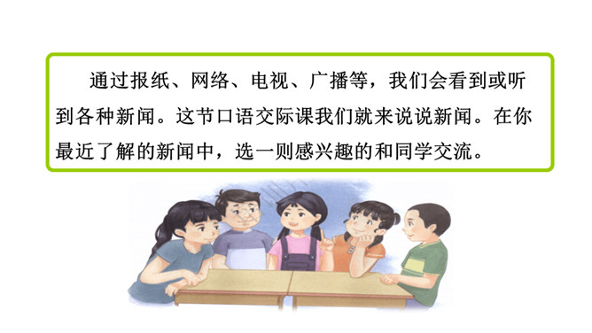 这次口语交际要求我们说一说最近了解的新闻。引导学生走进社会,了解和收集天下大小事,培养学生搜集材料和处理信息的能力。通过组织发布新闻和评议新闻的活动,提高口语交际能力,激励学生关心国内外大事和身边小事,激发学生热爱生活,关注生活的思想感情。1.看图寻思路。仔细看看插图,想一想每幅图上都画有哪些人?他们都在干什么?2.思考定主题。通过报纸、广播、电视、网络等渠道,搜集国际、国内新闻,或用调查、访问等形式了解周围最近发生的事情,新闻要真实,要及时,还要有价值。从中选择自己感兴趣的练说几遍。所属专题:说新闻ppt。