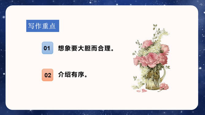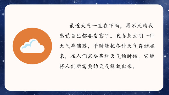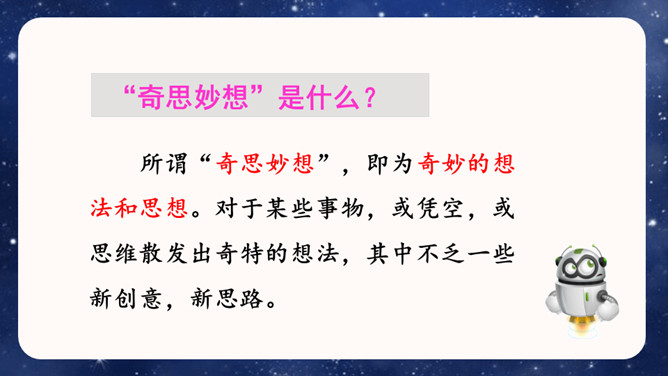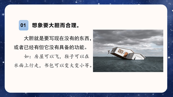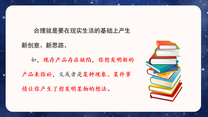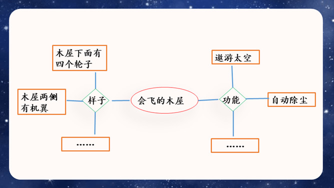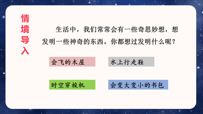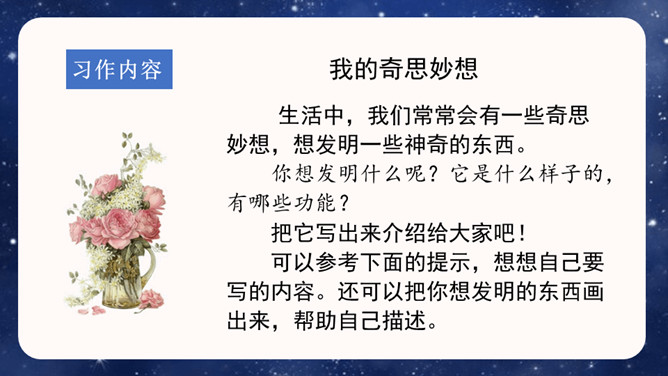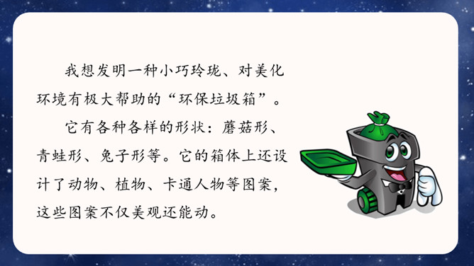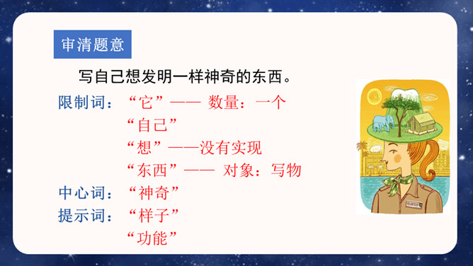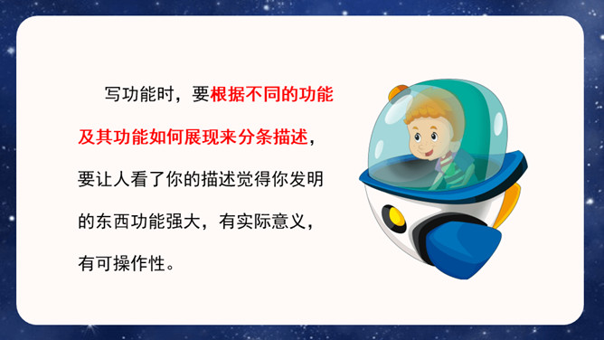 大胆就是要写现在没有的东西,或者已经有但它没有具备的功能。写功能时,要根据不同的功能及其功能如何展现来分条描述,要让人看了你的描述觉得你发明的东西功能强大,有实际意义,有可操作性。生活中,我们常常会有一些奇思妙想,想发明一些神奇的东西。你想发明什么呢?它是什么样子的,有哪些功能?把它写出来介绍给大家吧!可以参考下面的提示,想想自己要写的内容。还可以把你想发明的东西画出来,帮助自己描述。所属专题:我的奇思妙想ppt。