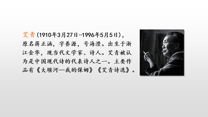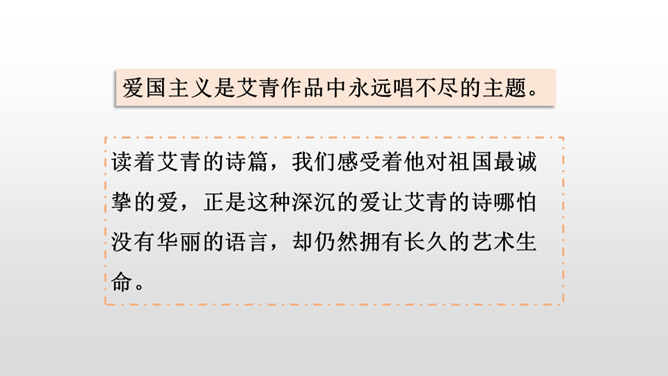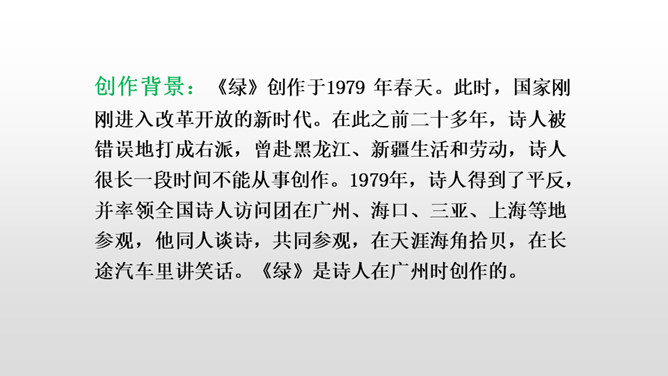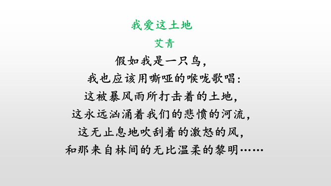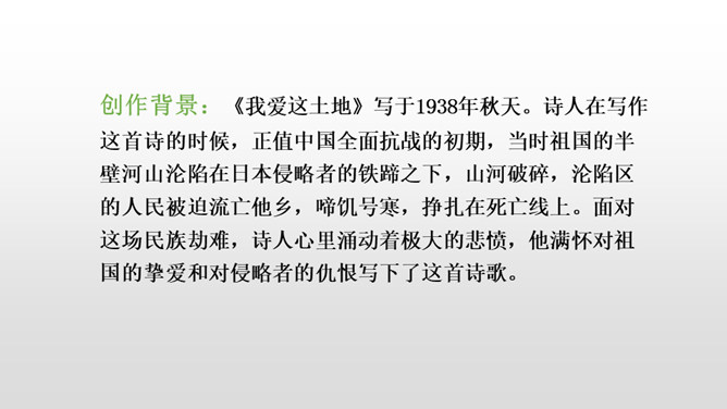 诗人在写作这首诗的时候,正值中国全面抗战的初期,当时祖国的半壁河山沦陷在日本侵略者的铁蹄之下,山河破碎,沦陷区的人民被迫流亡他乡,啼饥号寒,挣扎在死亡线上。面对这场民族劫难,诗人心里涌动着极大的悲愤,他满怀对祖国的挚爱和对侵略者的仇恨写下了这首诗歌。读着艾青的诗篇,我们感受着他对祖国最诚挚的爱,正是这种深沉的爱让艾青的诗哪怕没有华丽的语言,却仍然拥有长久的艺术生命。所属专题:绿ppt。