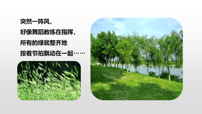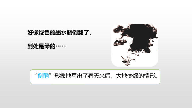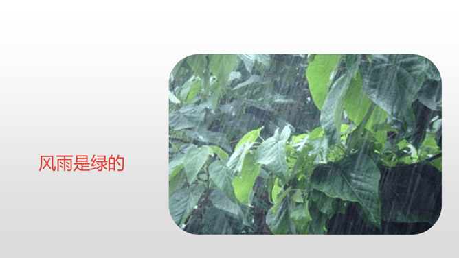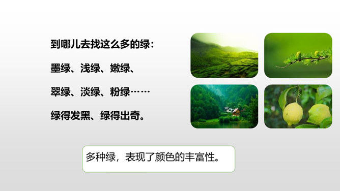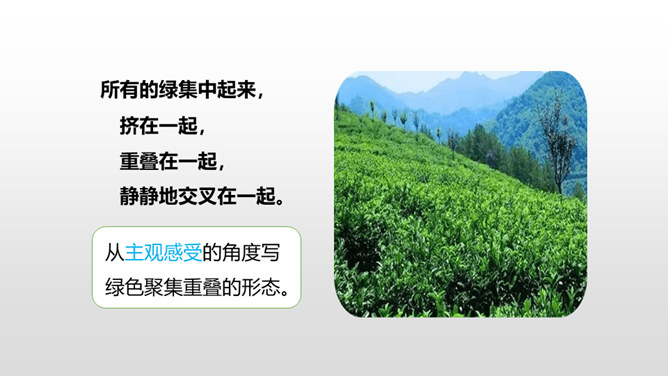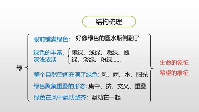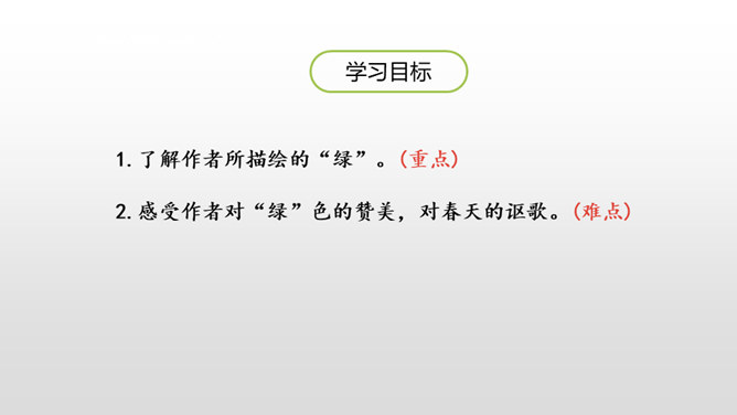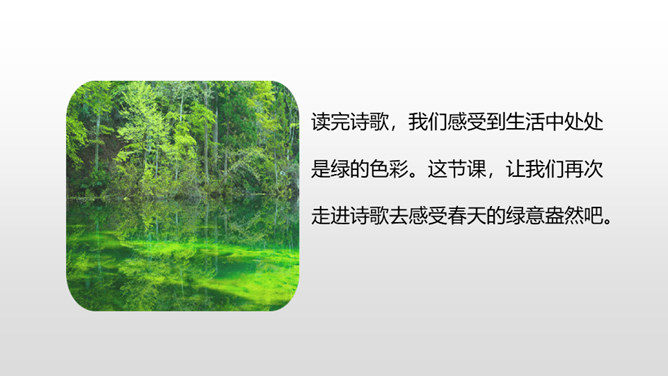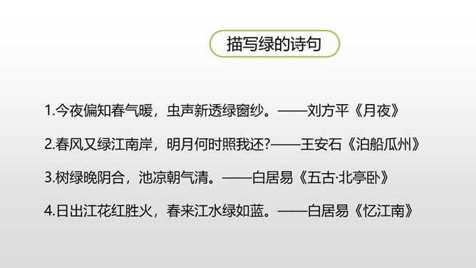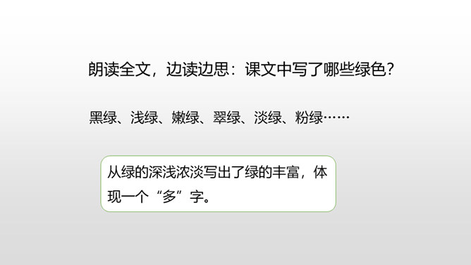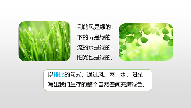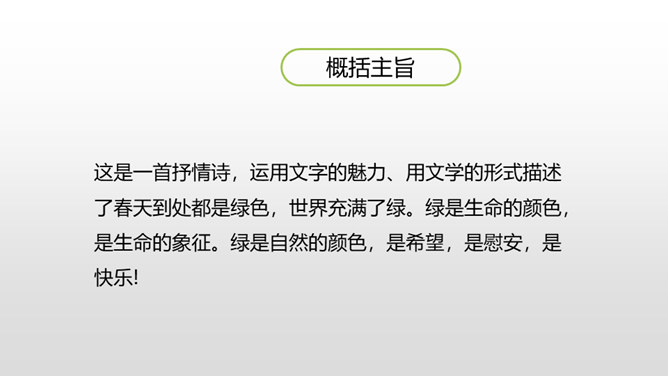 读完诗歌,我们感受到生活中处处是绿的色彩。这节课,让我们再次走进诗歌去感受春天的绿意盎然吧。这是一首抒情诗,运用文字的魅力、用文学的形式描述了春天到处都是绿色,世界充满了绿。绿是生命的颜色,是生命的象征。绿是自然的颜色,是希望,是慰安,是快乐!以排比的句式,通过风、雨、水、阳光,写出我们生存的整个自然空间充满绿色。朗读全文,边读边思:课文中写了哪些绿色?所属专题:绿ppt。