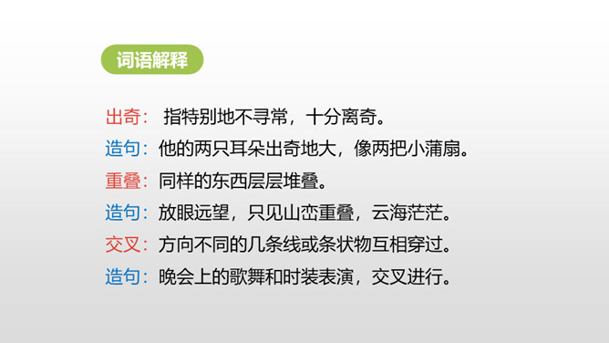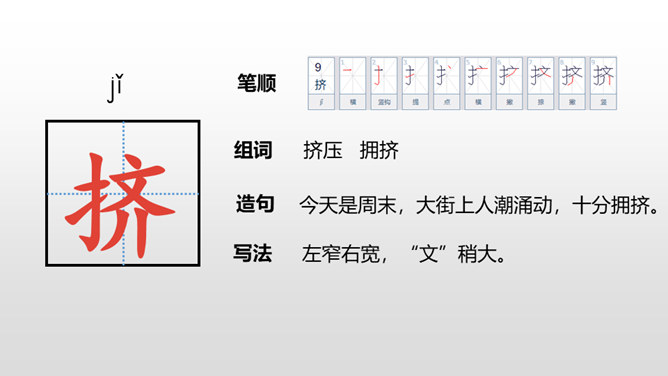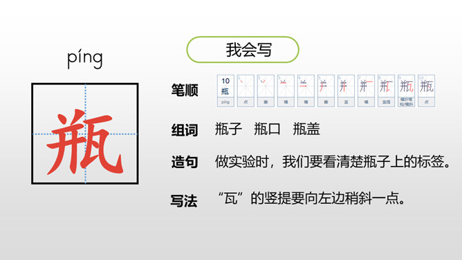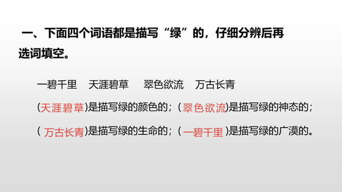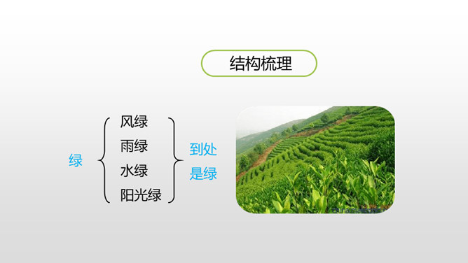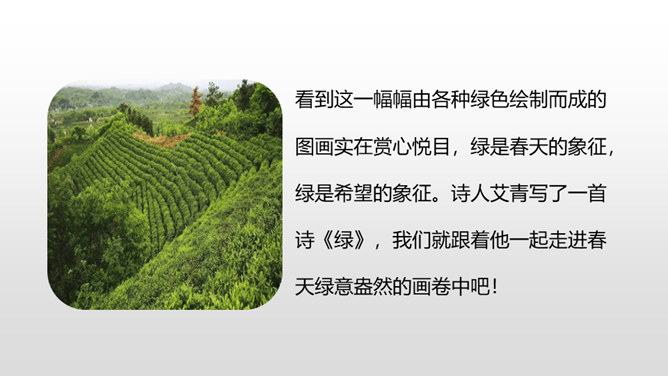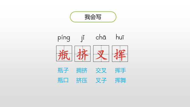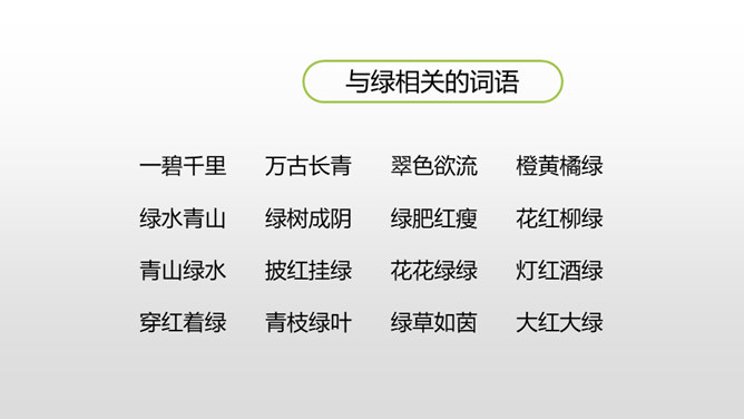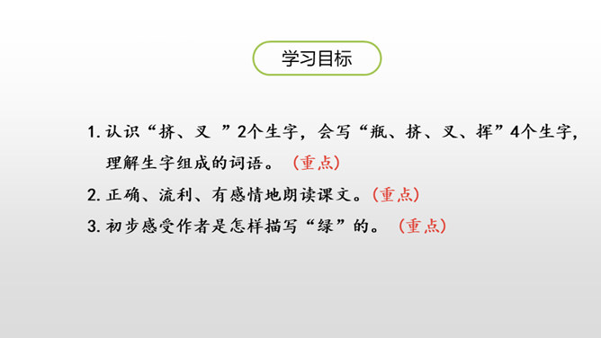 1.认识“挤、叉 ”2个生字,会写“瓶、挤、叉、挥”4个生字,理解生字组成的词语。 (重点)2.正确、流利、有感情地朗读课文。(重点)3.初步感受作者是怎样描写“绿”的。 (重点)看到这一幅幅由各种绿色绘制而成的图画实在赏心悦目,绿是春天的象征,绿是希望的象征。诗人艾青写了一首诗《绿》,我们就跟着他一起走进春天绿意盎然的画卷中吧!自由读课文,边读边想:作者是怎样描写绿的?到处是绿:风绿、雨绿、水绿、 阳光绿。所属专题:绿ppt。