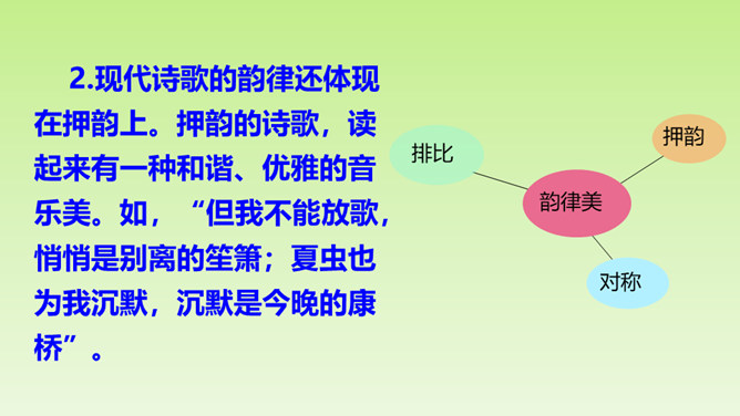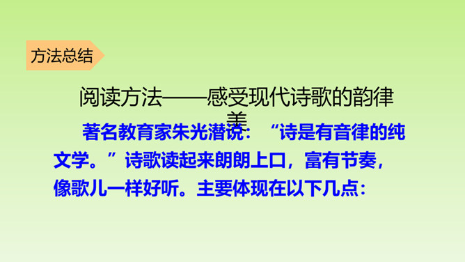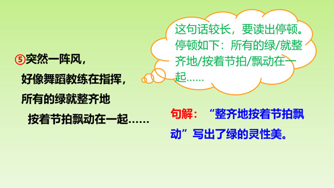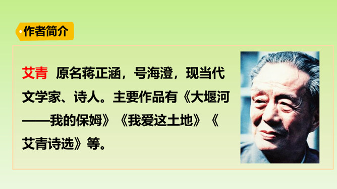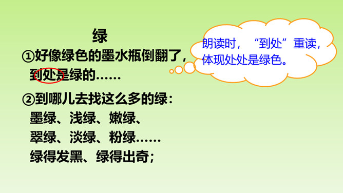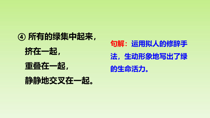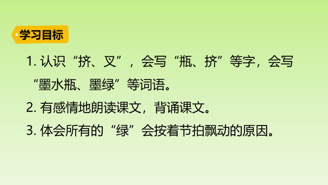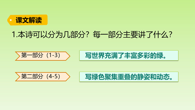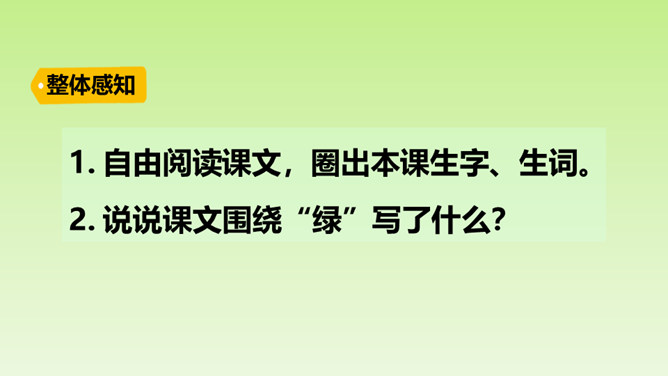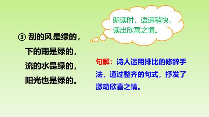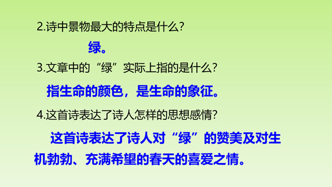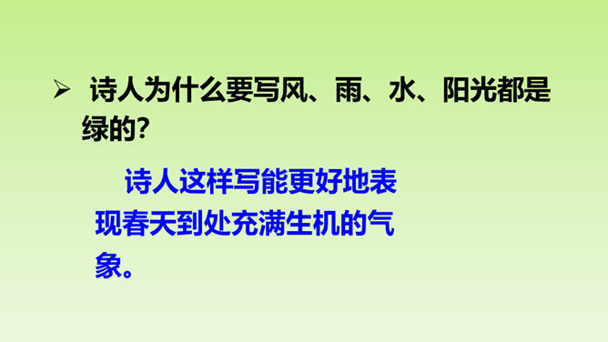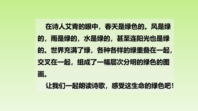 春天是什么颜色的?是红色,蓝色,黄色,还是彩色? 在诗人艾青的眼中,春天是绿色的。风是绿的,雨是绿的,水是绿的,甚至连阳光也是绿的。世界充满了绿,各种各样的绿重叠在一起,交叉在一起,组成了一幅层次分明的绿色的图画。 让我们一起朗读诗歌,感受这生命的绿色吧!诗人为什么要写风、雨、水、阳光都是绿的?诗人这样写能更好地表现春天到处充满生机的气象。朗读时,“到处”重读,体现处处是绿色。所属专题:绿ppt。