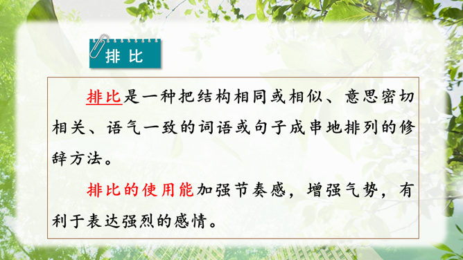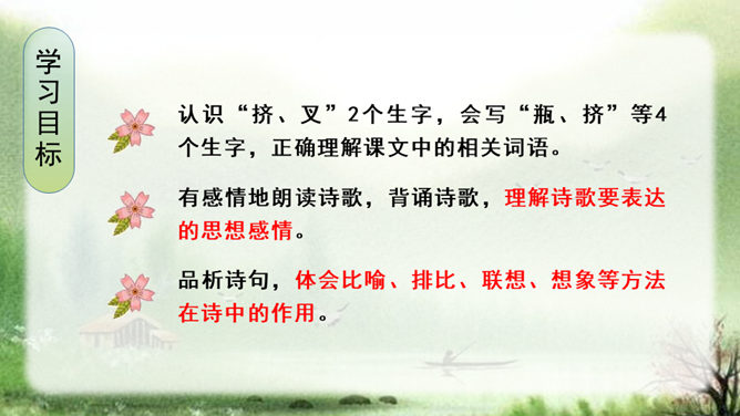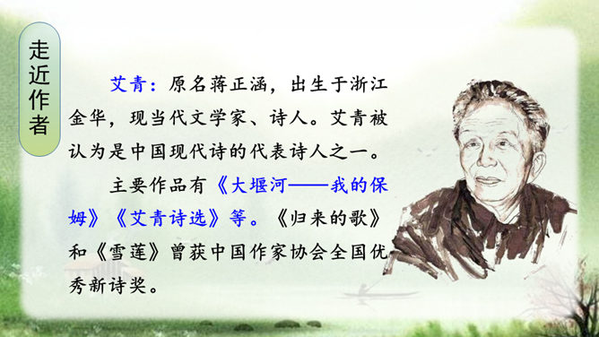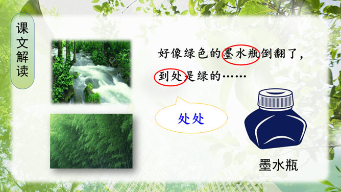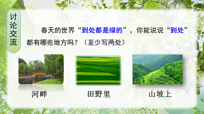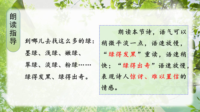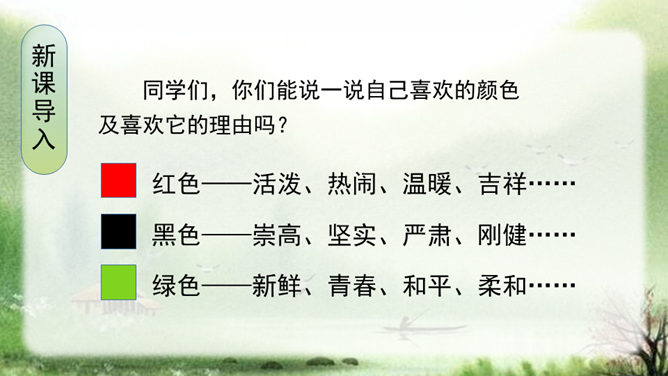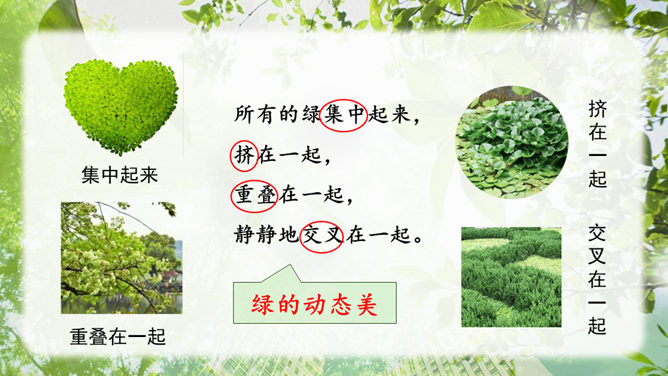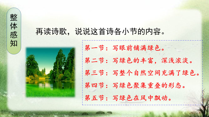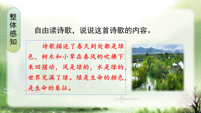 同学们,你们能说一说自己喜欢的颜色及喜欢它的理由吗?诗歌描述了春天到处都是绿色,树木和小草在春风的吹拂下来回摆动,风是绿的,水是绿的,世界充满了绿。绿是生命的颜色,是生命的象征。第一节:写眼前铺满绿色。第二节:写绿色的丰富,深浅浓淡。第三节:写整个自然空间充满了绿色。第四节:写绿色聚集重叠的形态。第五节:写绿色在风中飘动。我觉得是诗人满眼满心被绿充斥,被眼前的绿所震撼而产生的一种独特感受。所属专题:绿ppt。