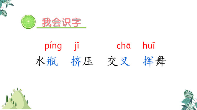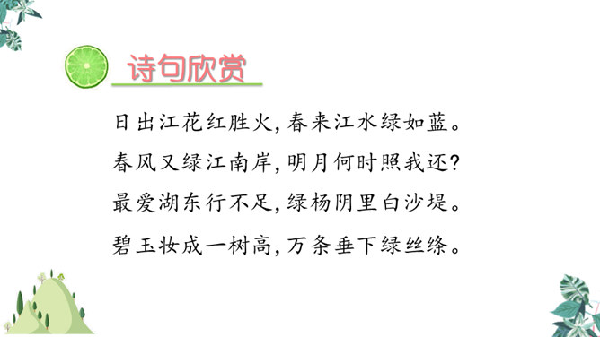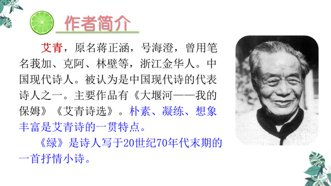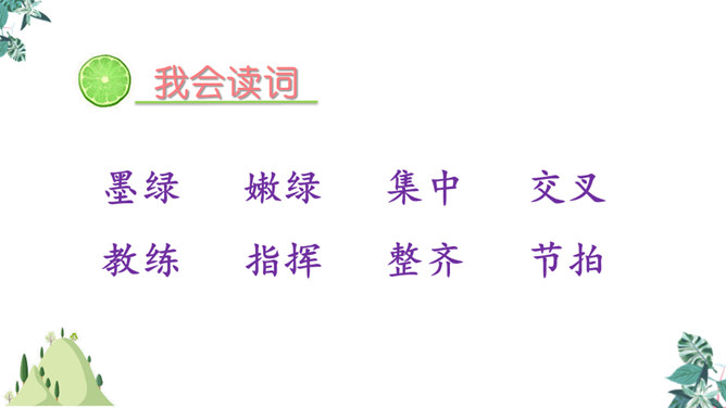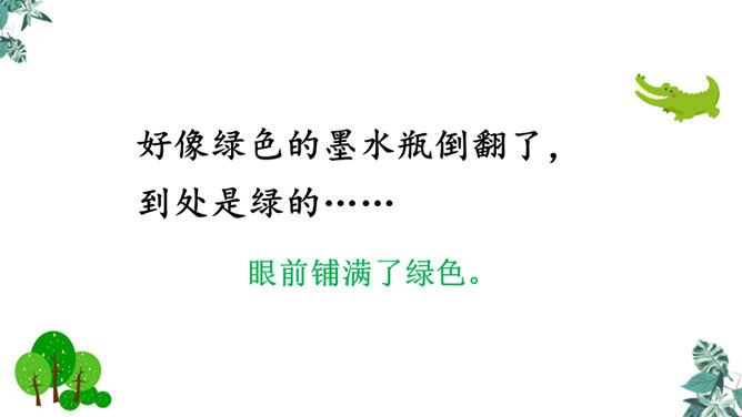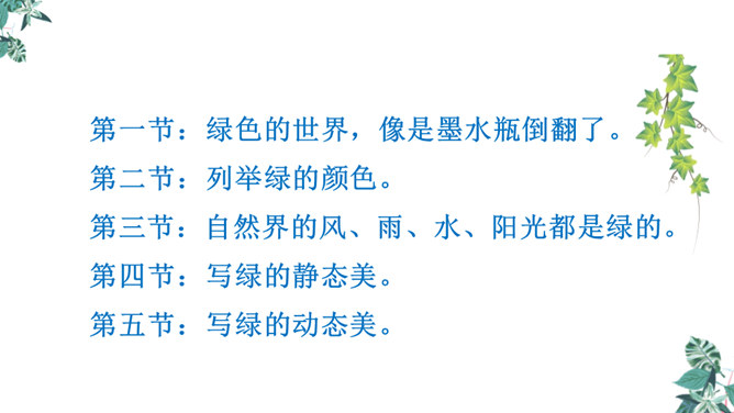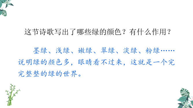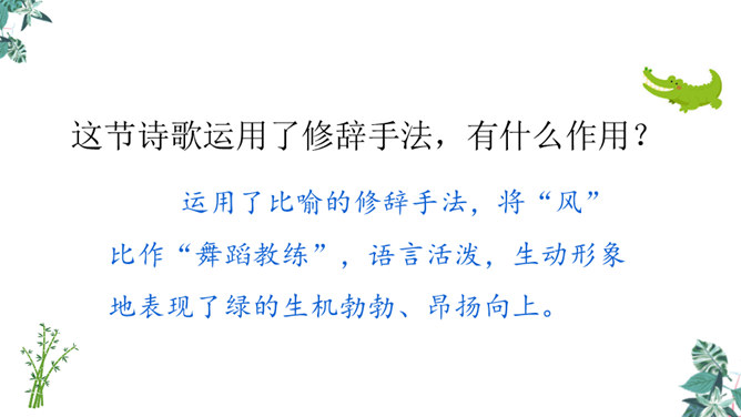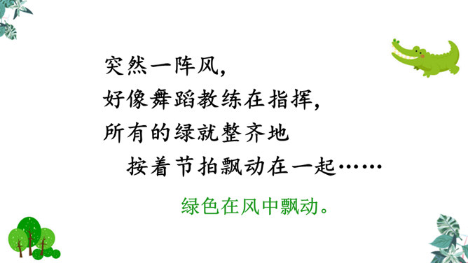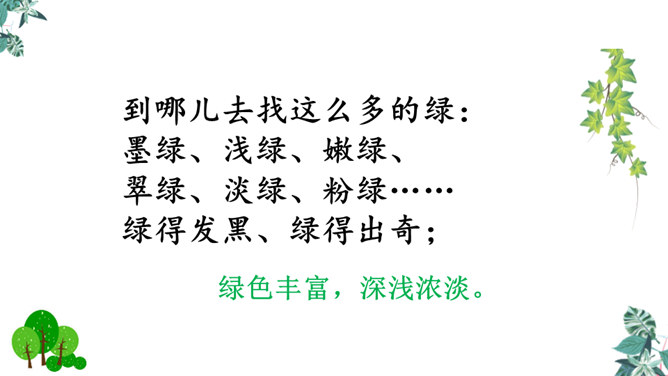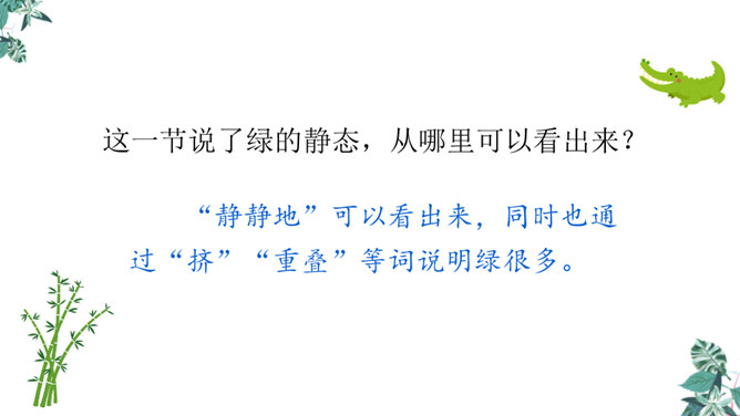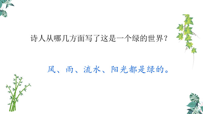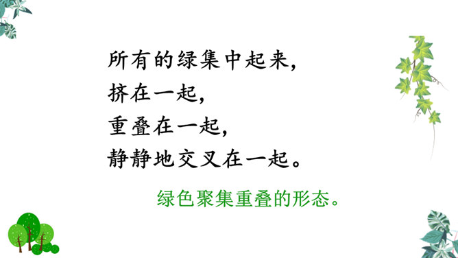 墨绿、浅绿、嫩绿、翠绿、淡绿、粉绿……说明绿的颜色多,眼睛看不过来,这就是一个完完整整的绿的世界。诗人从哪几方面写了这是一个绿的世界?风、雨、流水、阳光都是绿的。这一节说了绿的静态,从哪里可以看出来?“静静地”可以看出来,同时也通过“挤”“重叠”等词说明绿很多。这节诗歌运用了修辞手法,有什么作用?运用了比喻的修辞手法,将“风”比作“舞蹈教练”,语言活泼,生动形象地表现了绿的生机勃勃、昂扬向上。所属专题:绿ppt。