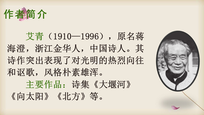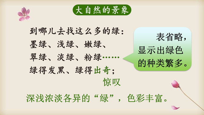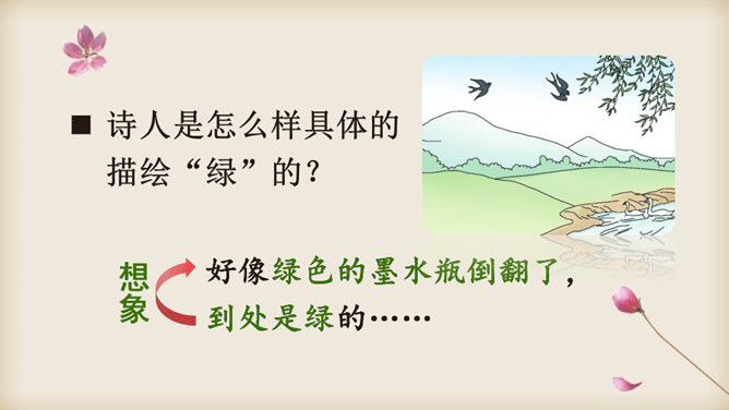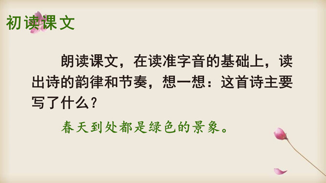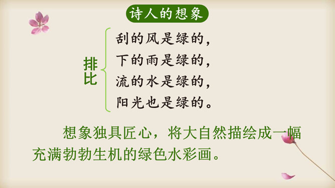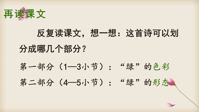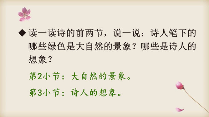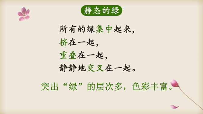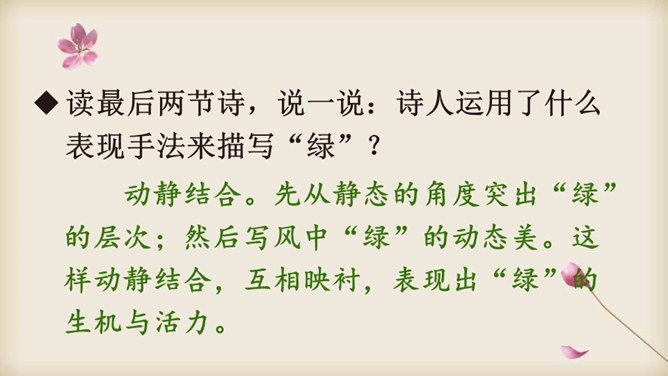朗读课文,在读准字音的基础上,读出诗的韵律和节奏,想一想:这首诗主要写了什么?读一读诗的前两节,说一说:诗人笔下的哪些绿色是大自然的景象?哪些是诗人的想象?读最后两节诗,说一说:诗人运用了什么表现手法来描写“绿”?动静结合。先从静态的角度突出“绿”的层次;然后写风中“绿”的动态美。这样动静结合,互相映衬,表现出“绿”的生机与活力。你从诗中体会到了怎样的情感?所属专题:绿ppt。