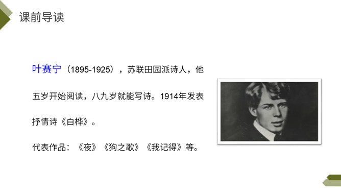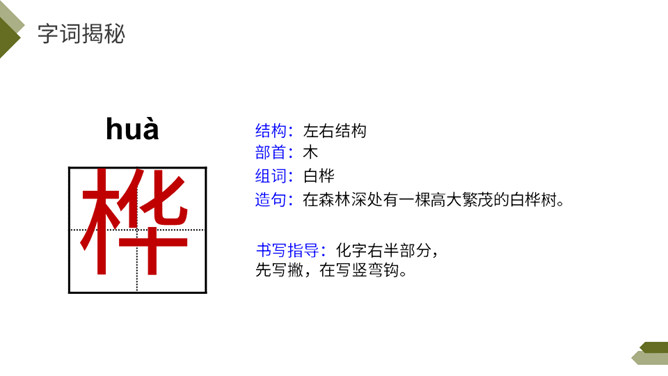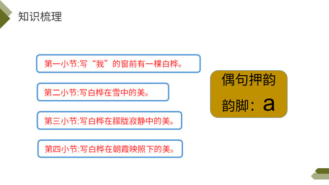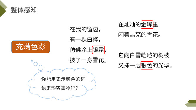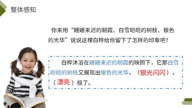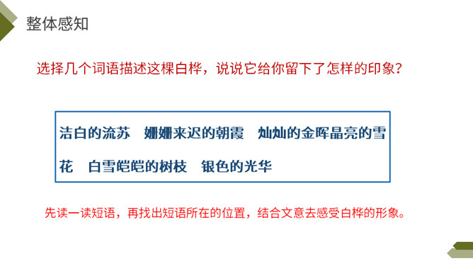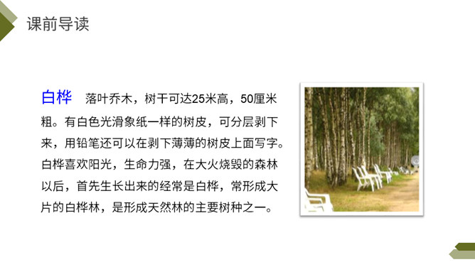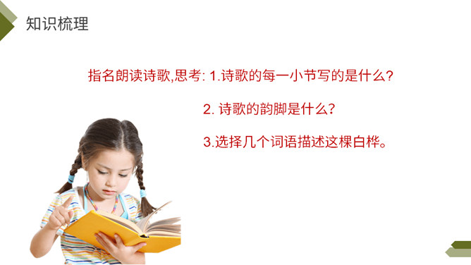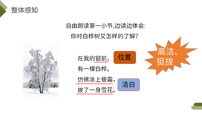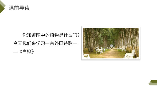 你知道图中的植物是什么吗?今天我们来学习一首外国诗歌——《白桦》。指名朗读诗歌,思考: 1.诗歌的每一小节写的是什么?2. 诗歌的韵脚是什么?3.选择几个词语描述这棵白桦。选择几个词语描述这棵白桦,说说它给你留下了怎样的印象?先读一读短语,再找出短语所在的位置,结合文意去感受白桦的形象。 再次读一读全诗,找一找作者运用了哪些表示颜色的词语。自由朗读第一小节,边读边体会:你对白桦树又怎样的了解?所属专题:白桦ppt。
