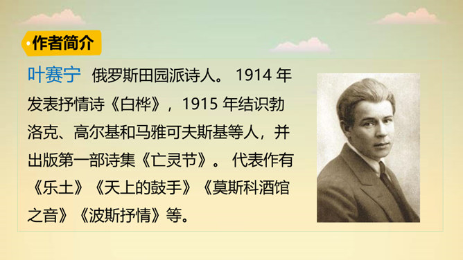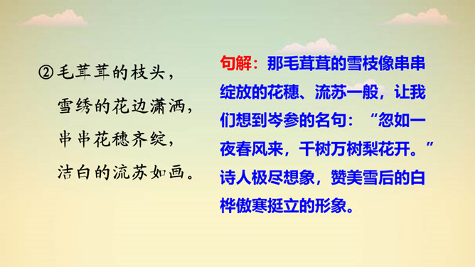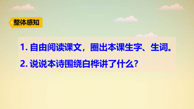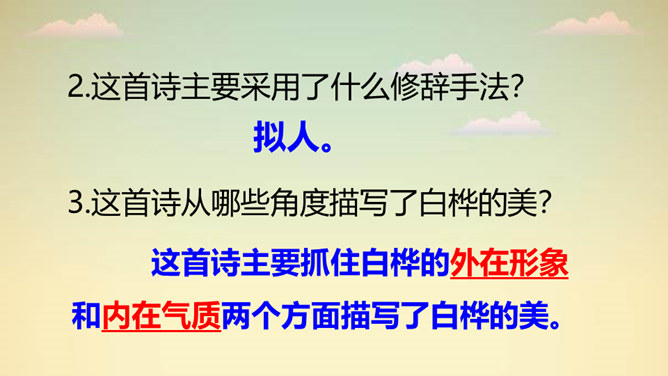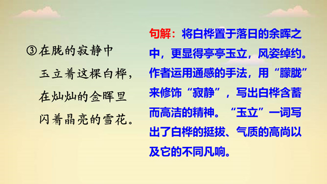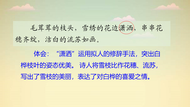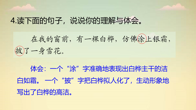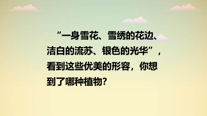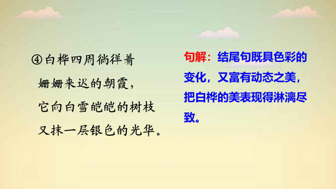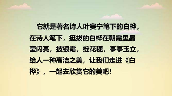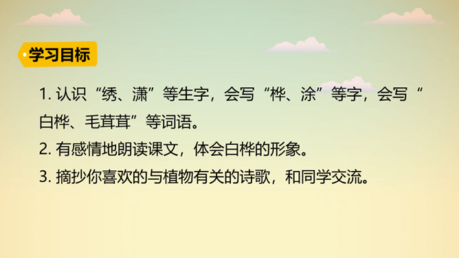 “一身雪花、雪绣的花边、洁白的流苏、银色的光华”,看到这些优美的形容,你想到了哪种植物?它就是著名诗人叶赛宁笔下的白桦。在诗人笔下,挺拔的白桦在朝霞里晶莹闪亮,披银霜,绽花穗,亭亭玉立,给人一种高洁之美,让我们走进《白桦》,一起去欣赏它的美吧!1. 认识“绣、潇”等生字,会写“桦、涂”等字,会写“白桦、毛茸茸”等词语。2. 有感情地朗读课文,体会白桦的形象。3. 摘抄你喜欢的与植物有关的诗歌,和同学交流。所属专题:白桦ppt。