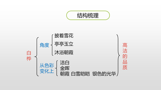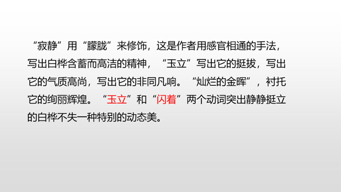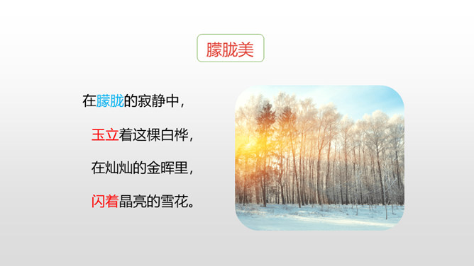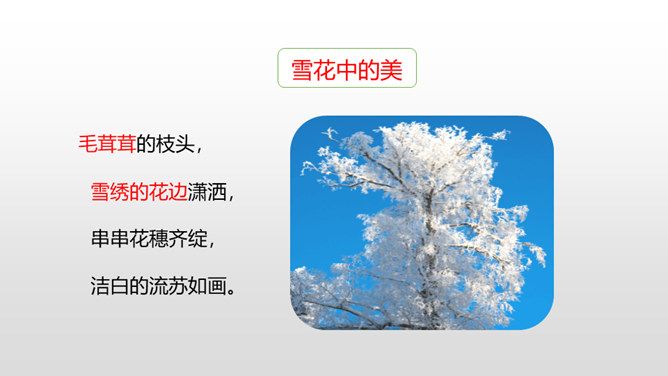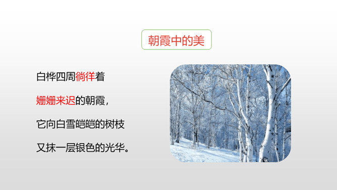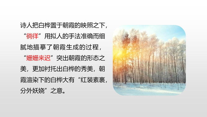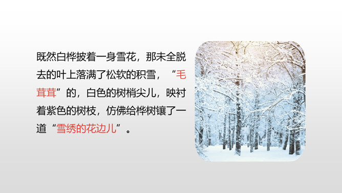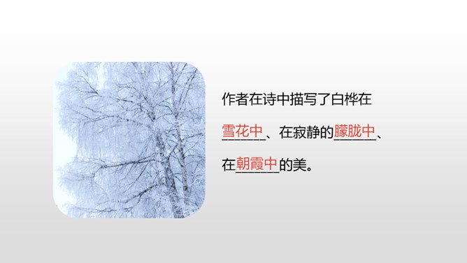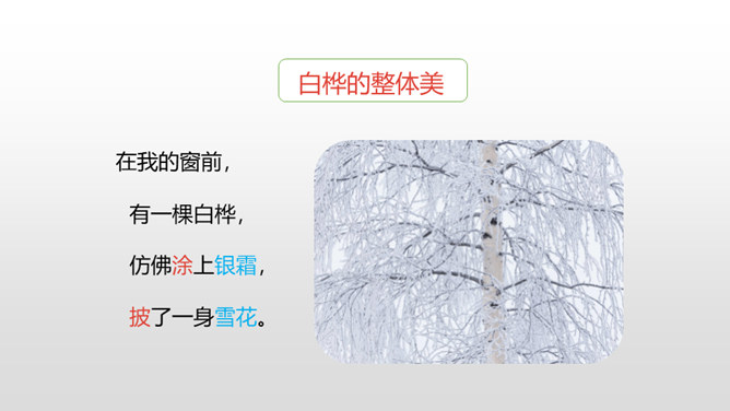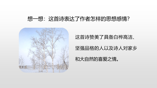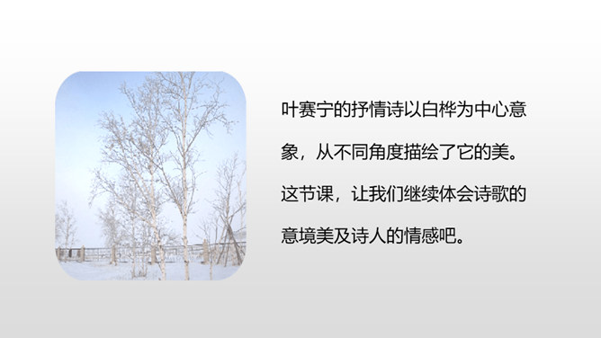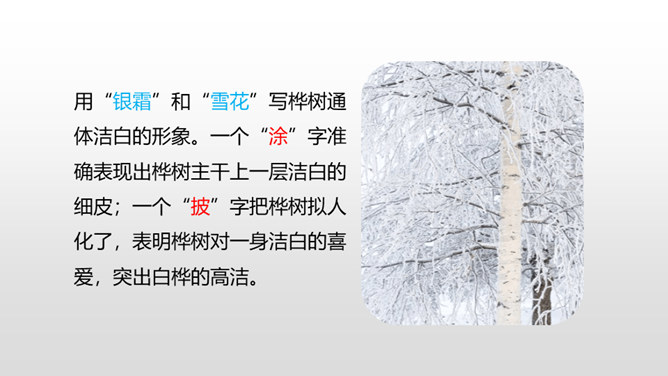 1.感受诗歌的意境美,及诗人的情感。(重点)2.通过阅读诗歌,感受诗歌的魅力。(难点)叶赛宁的抒情诗以白桦为中心意象,从不同角度描绘了它的美。这节课,让我们继续体会诗歌的意境美及诗人的情感吧。 用“银霜”和“雪花”写桦树通体洁白的形象。一个“涂”字准确表现出桦树主干上一层洁白的细皮;一个“披”字把桦树拟人化了,表明桦树对一身洁白的喜爱,突出白桦的高洁。既然白桦披着一身雪花,那未全脱去的叶上落满了松软的积雪,“毛茸茸”的,白色的树梢尖儿,映衬着紫色的树枝,仿佛给桦树镶了一道“雪绣的花边儿”。所属专题:白桦ppt。