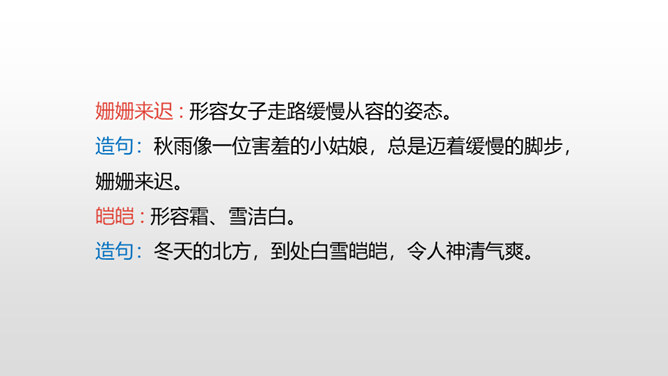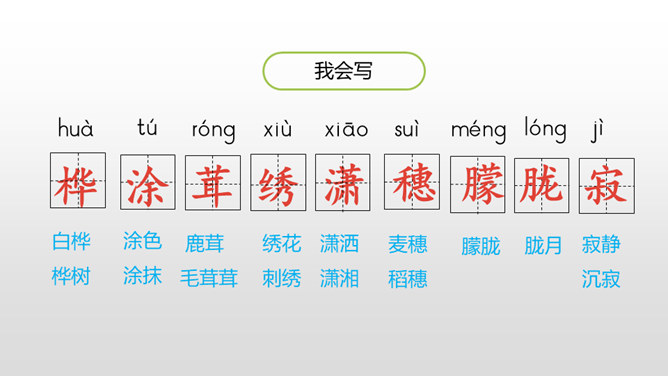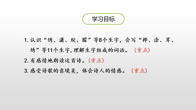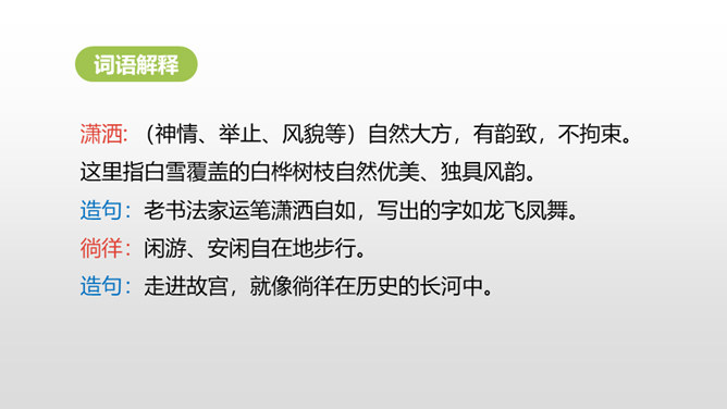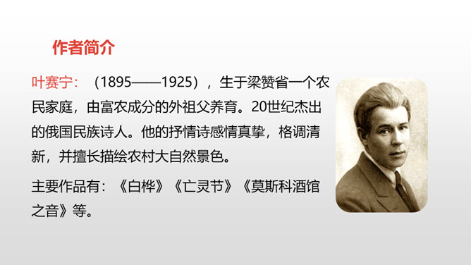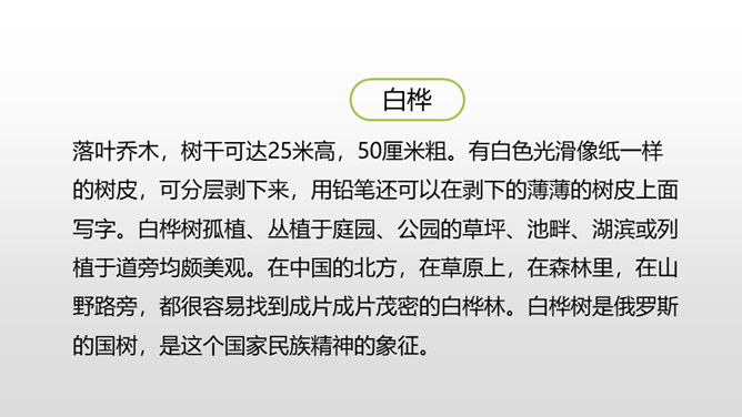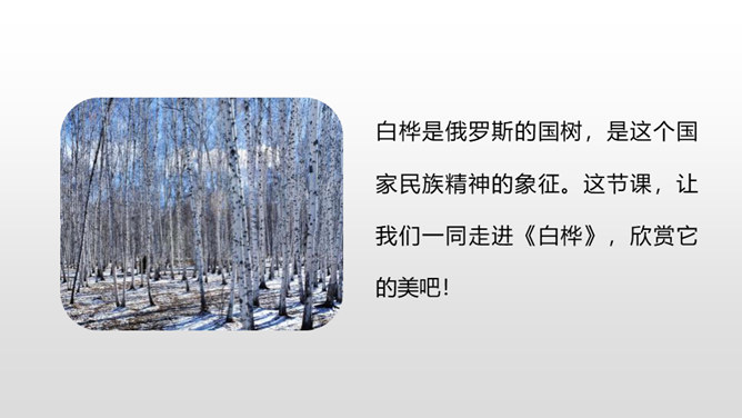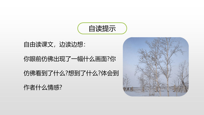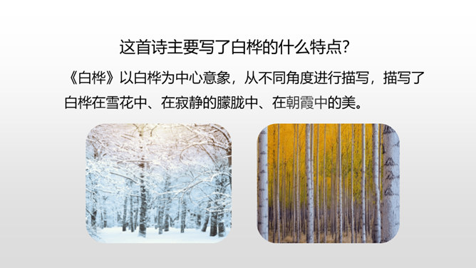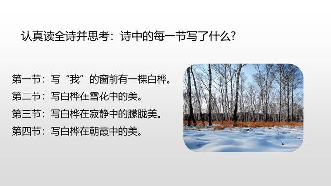 自由读课文,边读边想:你眼前仿佛出现了一幅什么画面?你仿佛看到了什么?想到了什么?体会到作者什么情感?首诗主要写了白桦的什么特点?以白桦为中心意象,从不同角度进行描写,描写了白桦在雪花中、在寂静的朦胧中、在朝霞中的美。认真读全诗并思考:诗中的每一节写了什么? 第一节:写“我”的窗前有一棵白桦。第二节:写白桦在雪花中的美。第三节:写白桦在寂静中的朦胧美。第四节:写白桦在朝霞中的美。所属专题:白桦ppt。