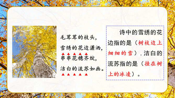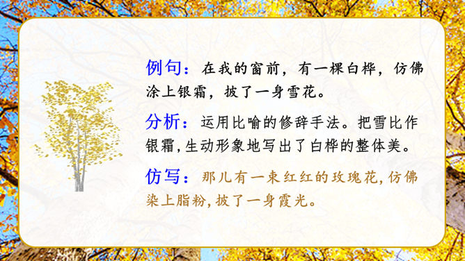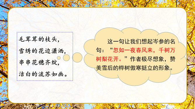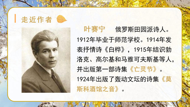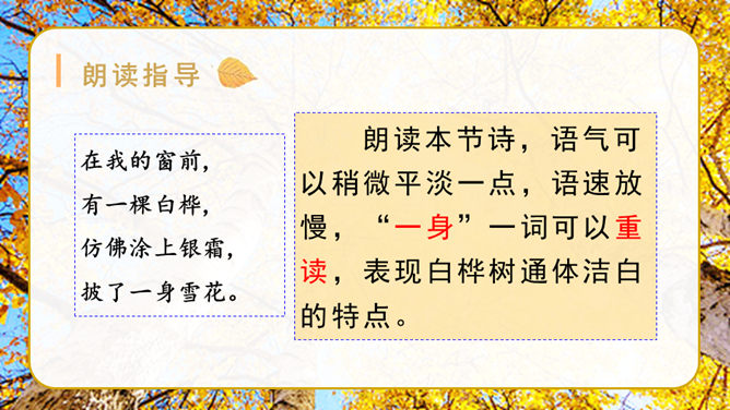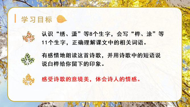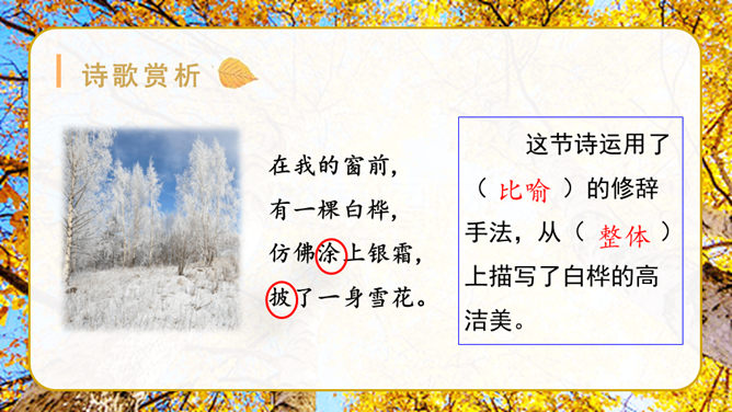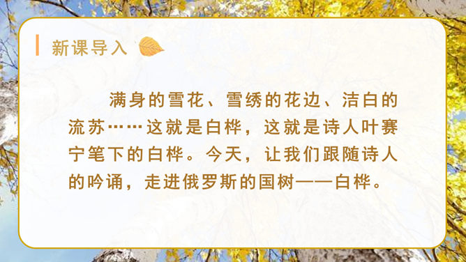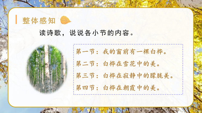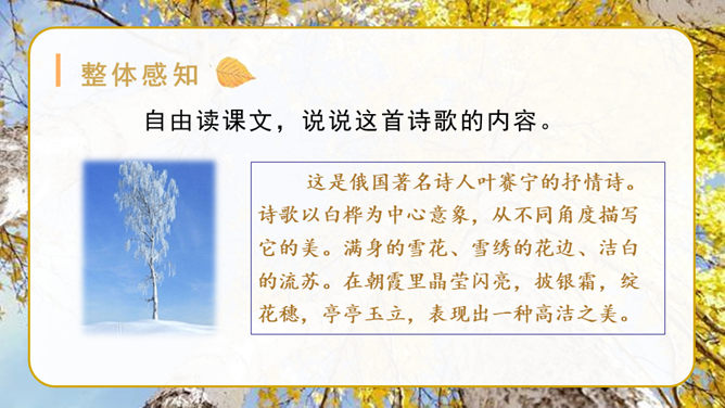 诗歌中常常写到一些植物,如松、竹、梅、兰,你知道哪些与植物有关的诗歌?摘抄你最喜欢的一首,和同学交流。还可以试着当个“小诗人”写写诗,把自己的感受表达出来。写的时候注意分行。写完后,和同学交流。诗人在字里行间充溢着对白桦由衷的喜爱、赞美和崇敬之情。白桦是俄罗斯的国树,它生性耐寒,又通体银白,气质高雅,所以诗人对白桦的礼赞其中更包含着对民族的热爱,对祖国的炽烈情怀!所属专题:白桦ppt。