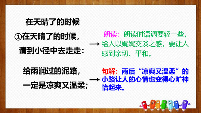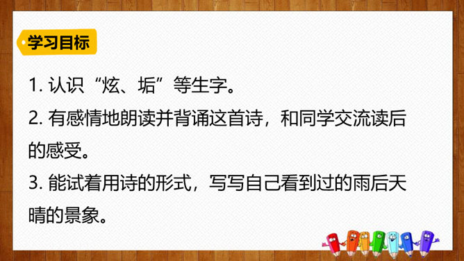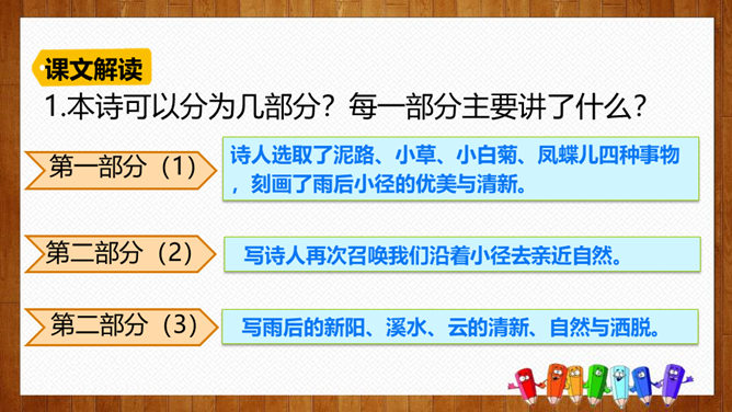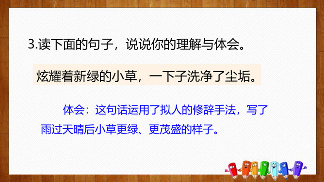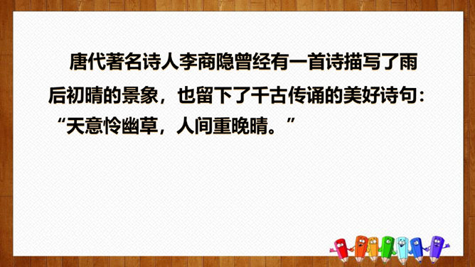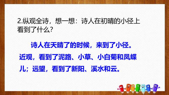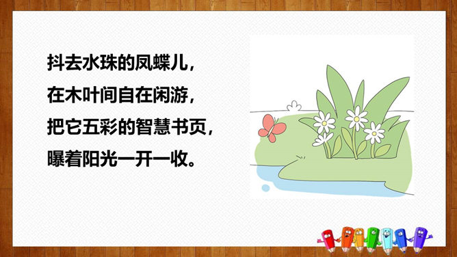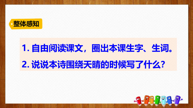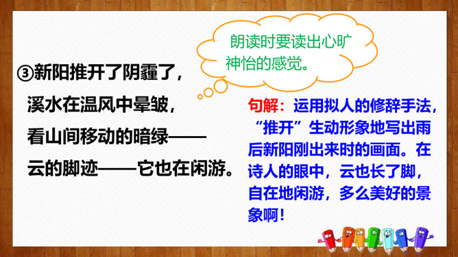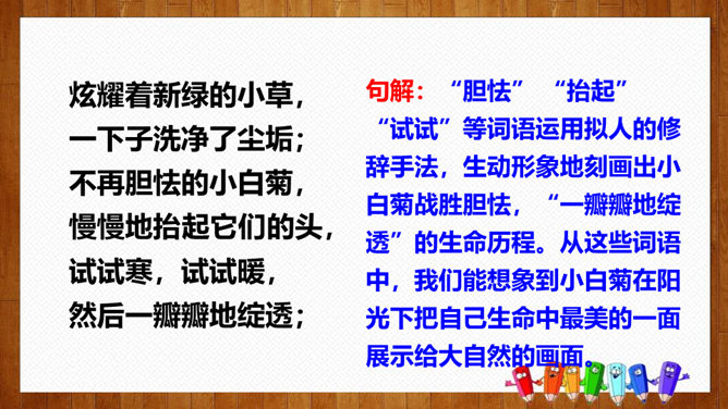 自由阅读课文,圈出本课生字、生词。说说本诗围绕天晴的时候写了什么?“胆怯” “抬起” “试试”等词语运用拟人的修辞手法,生动形象地刻画出小白菊战胜胆怯,“一瓣瓣地绽透”的生命历程。从这些词语中,我们能想象到小白菊在阳光下把自己生命中最美的一面展示给大自然的画面。第三小节描写了推开阴霾的新阳、晕皱的溪水及在山间闲游的云。放眼观望,一切都是那么清新、舒适,我们在诗人笔下的大自然中徜徉,便也拥有了大自然般博大的情怀,感受到大自然浓浓的爱意。所属专题:在天晴了的时候ppt。