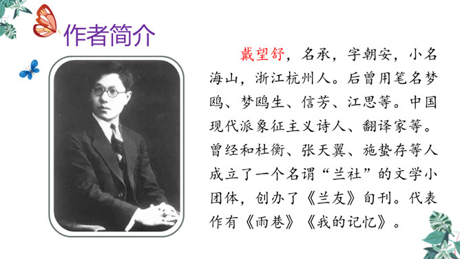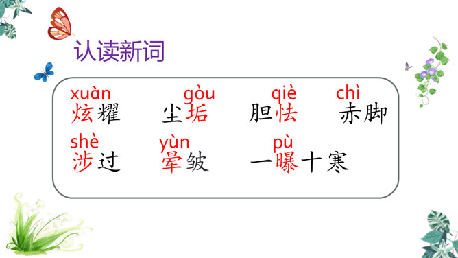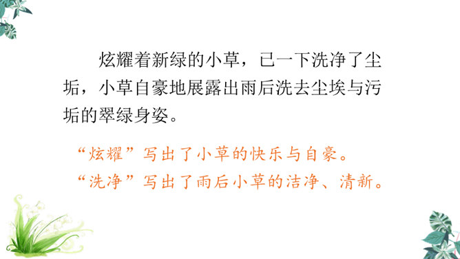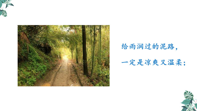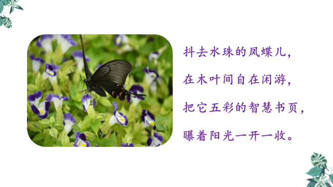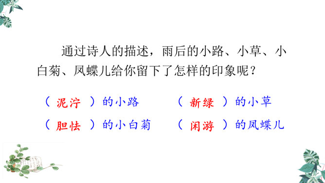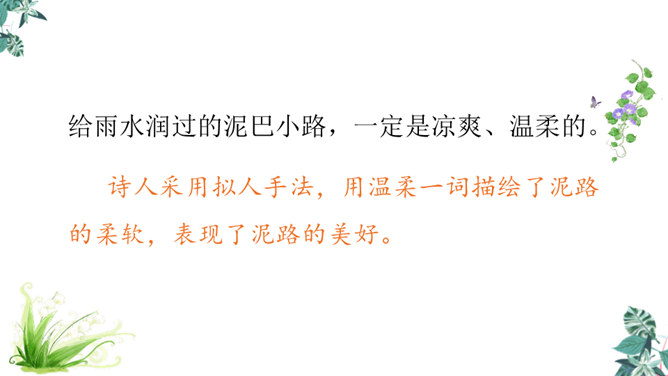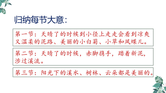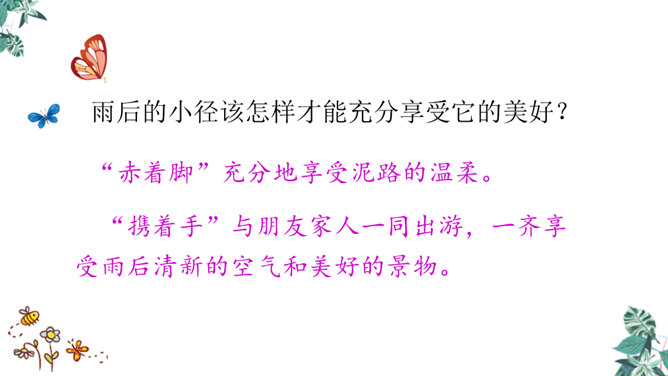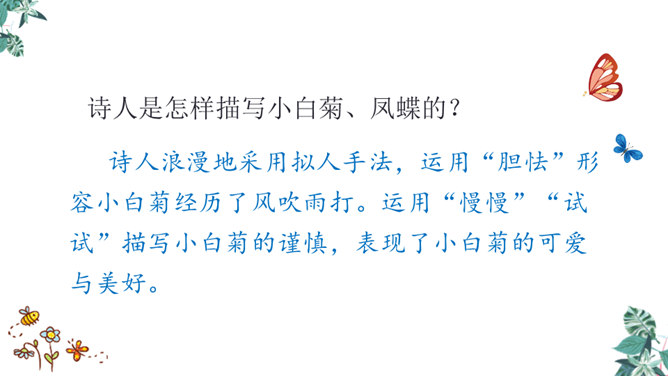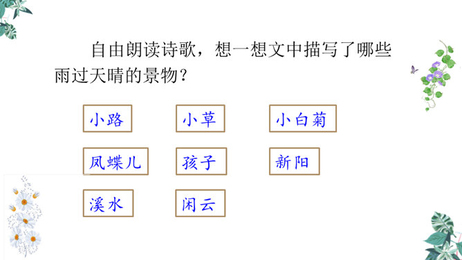 第一节:天晴了的时候到小径上走走会看到凉爽又温柔的泥路、美丽的小白菊、小草和凤蝶儿。第二节:天晴了的时候,赤脚携手,踏着新泥,涉过溪流。第三节:阳光下的溪水、树林、云朵都是美丽的。诗人采用拟人手法,用温柔一词描绘了泥路的柔软,表现了泥路的美好。“炫耀”写出了小草的快乐与自豪。“洗净”写出了雨后小草的洁净、清新。诗人是怎样描写小白菊、凤蝶的?所属专题:在天晴了的时候ppt。