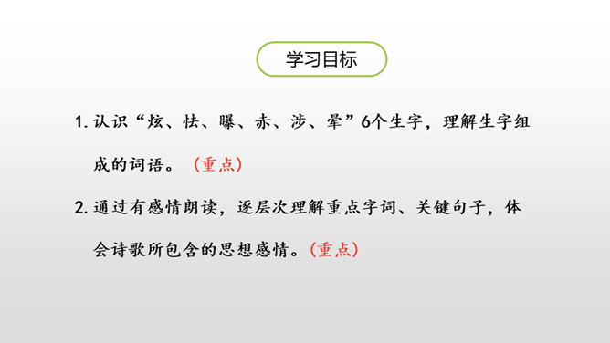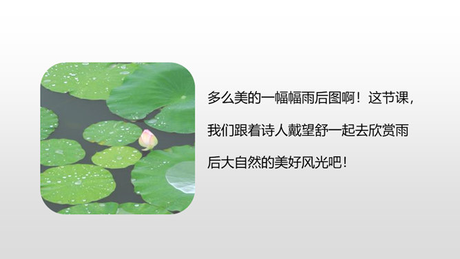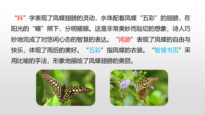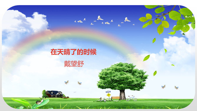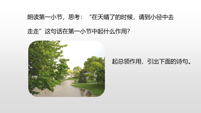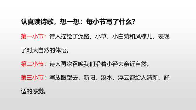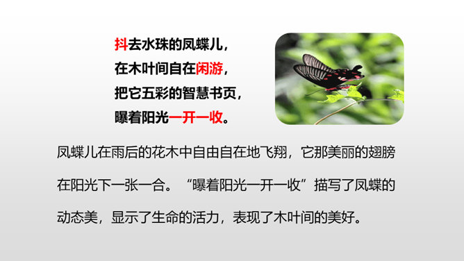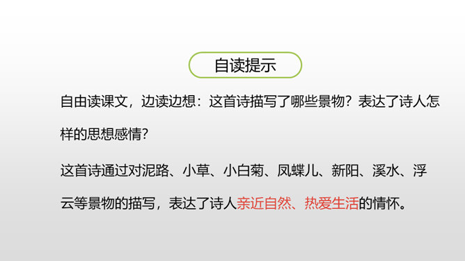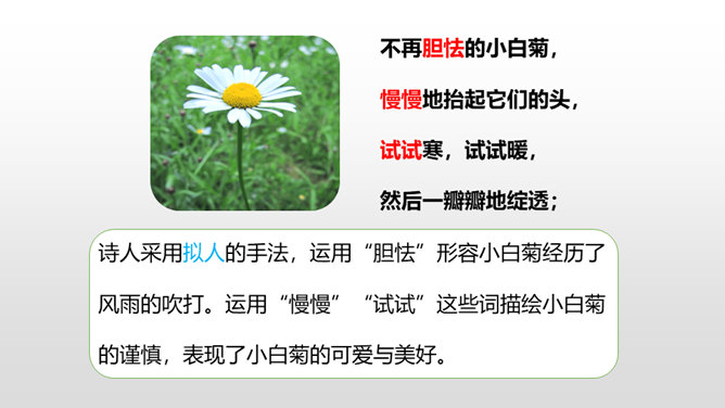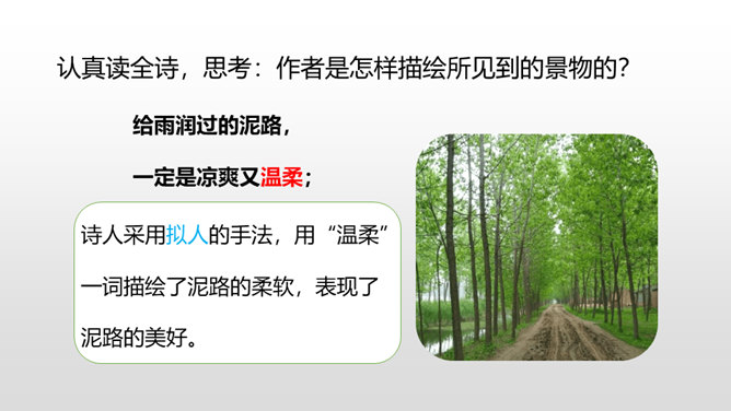 诗人采用拟人的手法,用“温柔”一词描绘了泥路的柔软,表现了泥路的美好。小草自豪地展露出雨后洗去尘埃与污垢的翠绿身姿。“炫耀”写出了小草的快乐与自豪。“洗净”写出了雨后小草的洁净、清新。诗人采用拟人的手法,运用“胆怯”形容小白菊经历了风雨的吹打。运用“慢慢”“试试”这些词描绘小白菊的谨慎,表现了小白菊的可爱与美好。从“携”“踏”“涉”可以体会到作者全心投入到了大自然,亲近大自然。所属专题:在天晴了的时候ppt。