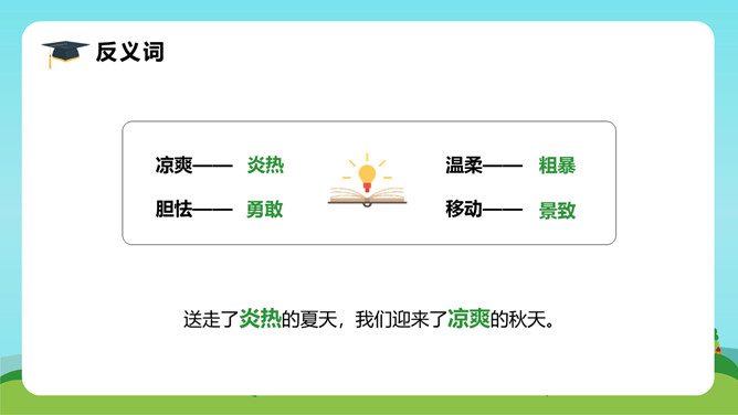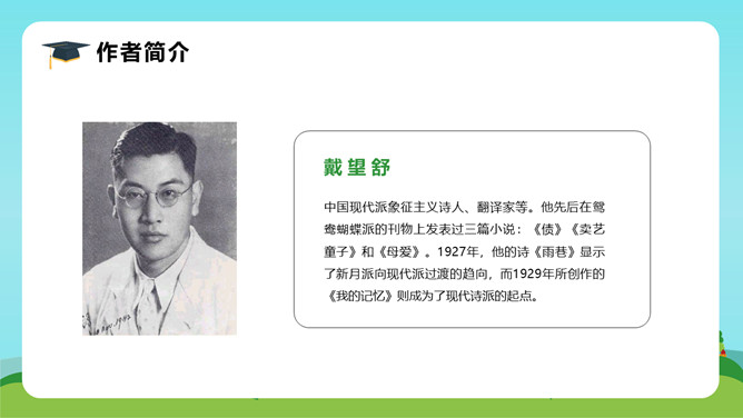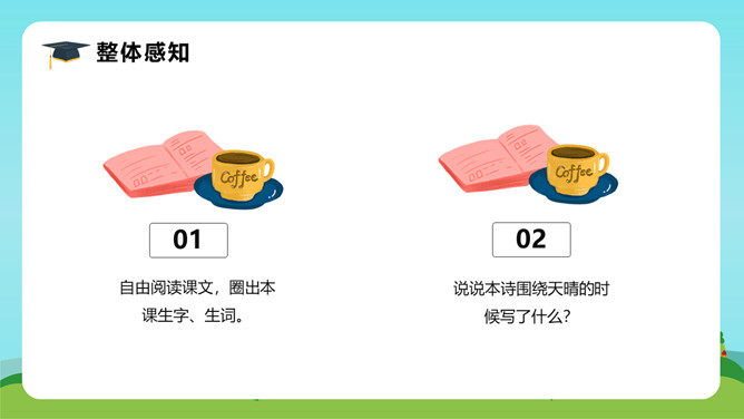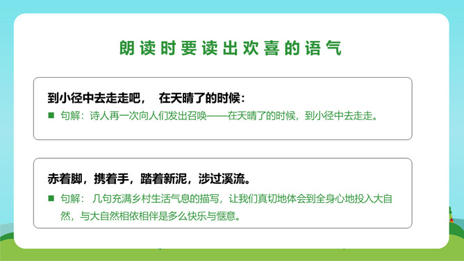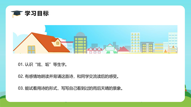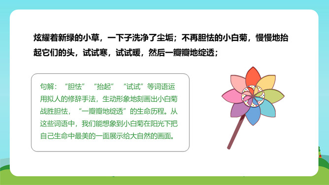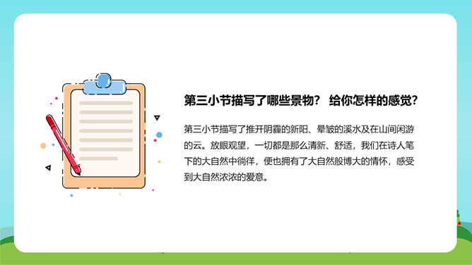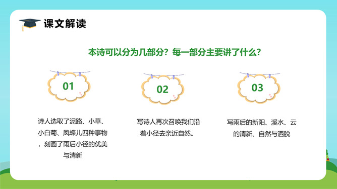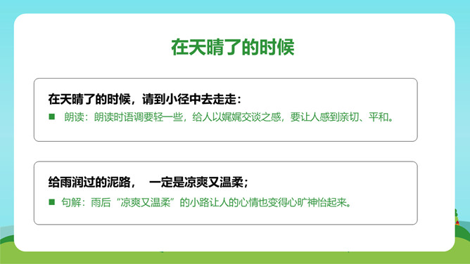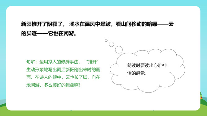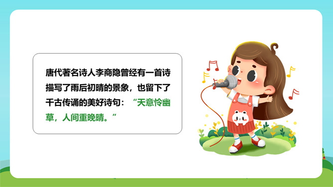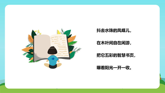 在这首生动、活泼、情趣盎然的小诗中,诗人以清新、优美的语言描绘了小径新雨后的美丽景象,表达了诗人亲近自然、热爱生活的情怀。体会:这几句诗运用了拟人、比喻的修辞手法。“闲游”把凤蝶儿拟人化,诗人又把凤蝶儿那一开一收的翅膀比作五彩的智慧书页,想象奇特,把我们带到了奇光异彩的曼妙世界。唐代著名诗人李商隐曾经有一首诗描写了雨后初晴的景象,也留下了千古传诵的美好诗句:“天意怜幽草,人间重晚晴。”所属专题:在天晴了的时候ppt。