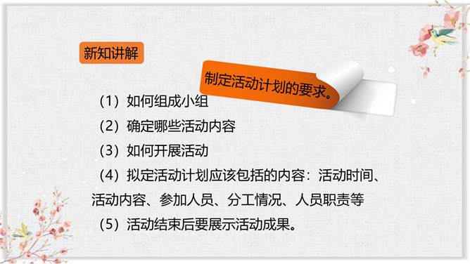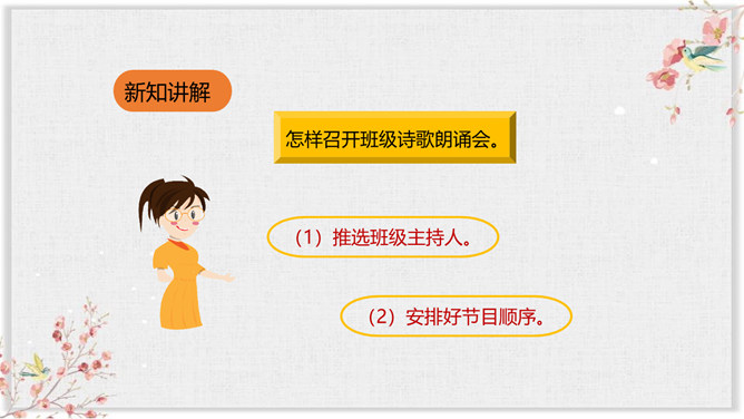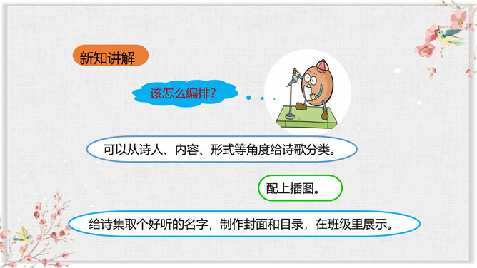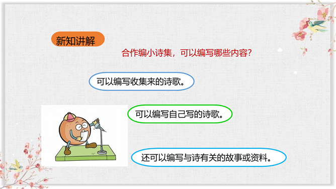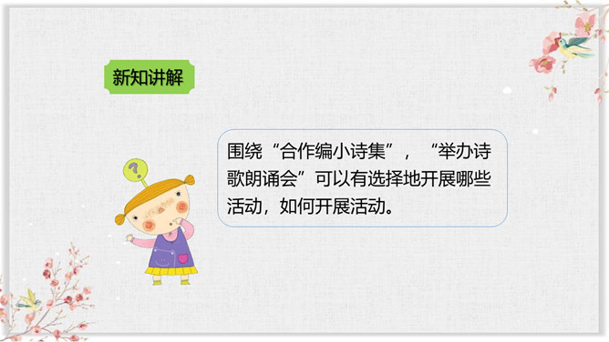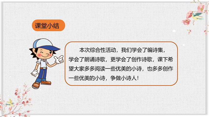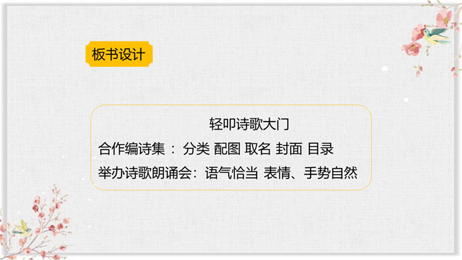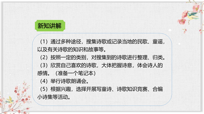 同学们,通过前面的学习,我们对诗歌有了一定的了解,也知道了一些关于诗歌的知识和故事。同学们想不想进一步走近诗歌,去了解更多有关诗歌的知识和趣事呢?你想知道哪些有关诗歌的知识呢?要求:从活动建议中知道一些什么?哪些建议要特别注意?对拟定活动计划有哪些帮助?本次综合性活动,我们学会了编诗集, 学会了朗诵诗歌,更学会了创作诗歌,课下希望大家多多阅读一些优美的小诗,也多多创作一些优美的小诗,争做小诗人!所属专题:轻扣诗歌大门ppt。
