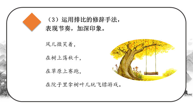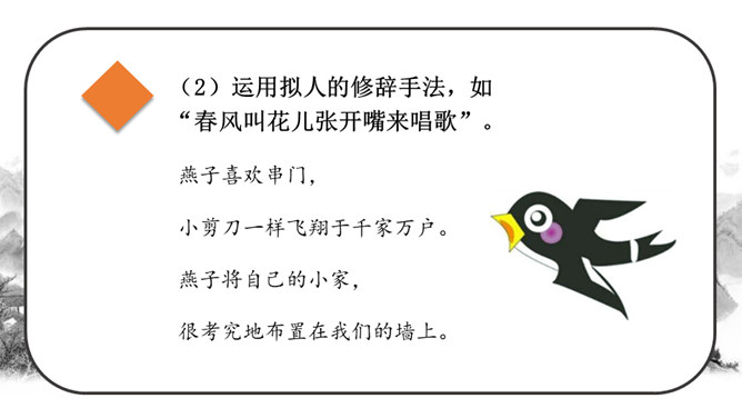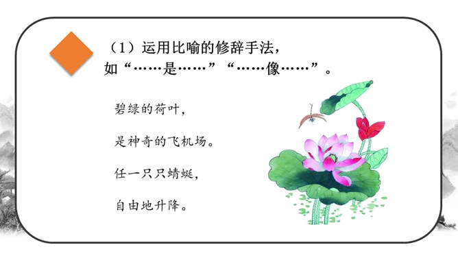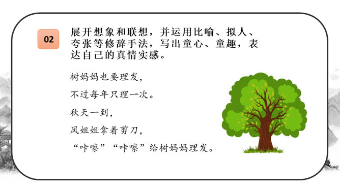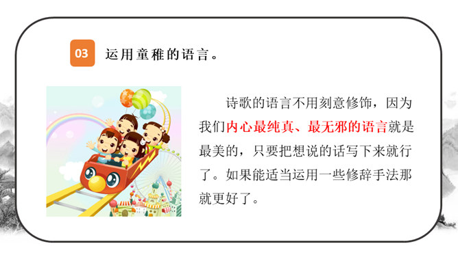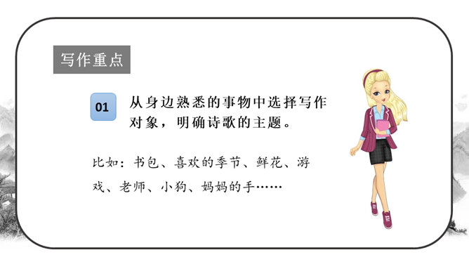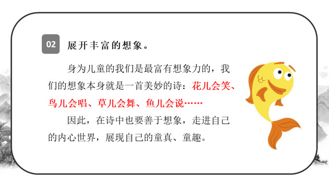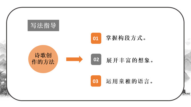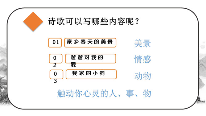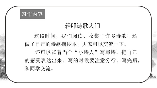 这段时间,我们阅读、收集了许多诗歌,还做了自己的诗歌摘抄本,大家可以交流一下。还可以试着当个“小诗人”写写诗,把自己的感受表达出来。写的时候要注意分行。写完后,和同学交流。选好了写作对象,可以先总写其特点,然后分节来描写;也可以直接以并列段的方式分不同方面写,如课文《在天晴了的时候》。身为儿童的我们是最富有想象力的,我们的想象本身就是一首美妙的诗:花儿会笑、鸟儿会唱、草儿会舞、鱼儿会说……所属专题:轻扣诗歌大门ppt。